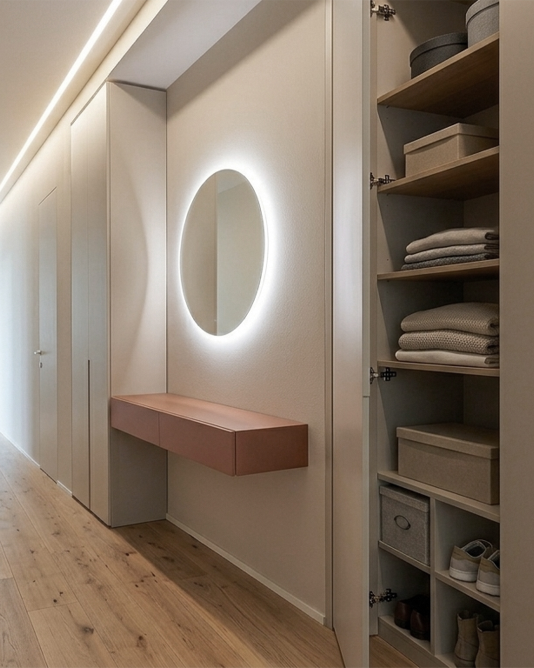 • Profondità degli arredi: la parola d’ordine in questa zona è slim. Opta per arredi che non superino i 20–25 cm di profondità. Sembrano pochi, ma sono perfetti per ospitare svuotatasche, scarpiere a ribalta o librerie espositive senza rubare respiro all’ambiente.