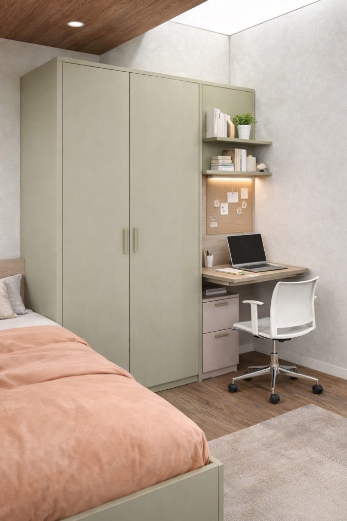 Integrare la scrivania in strutture libreria o nell’armadio laterale permette di vincere sul fronte spazio senza rinunce estetiche. Pensili, cassetti estraibili e moduli combinabili sono preziosi alleati.