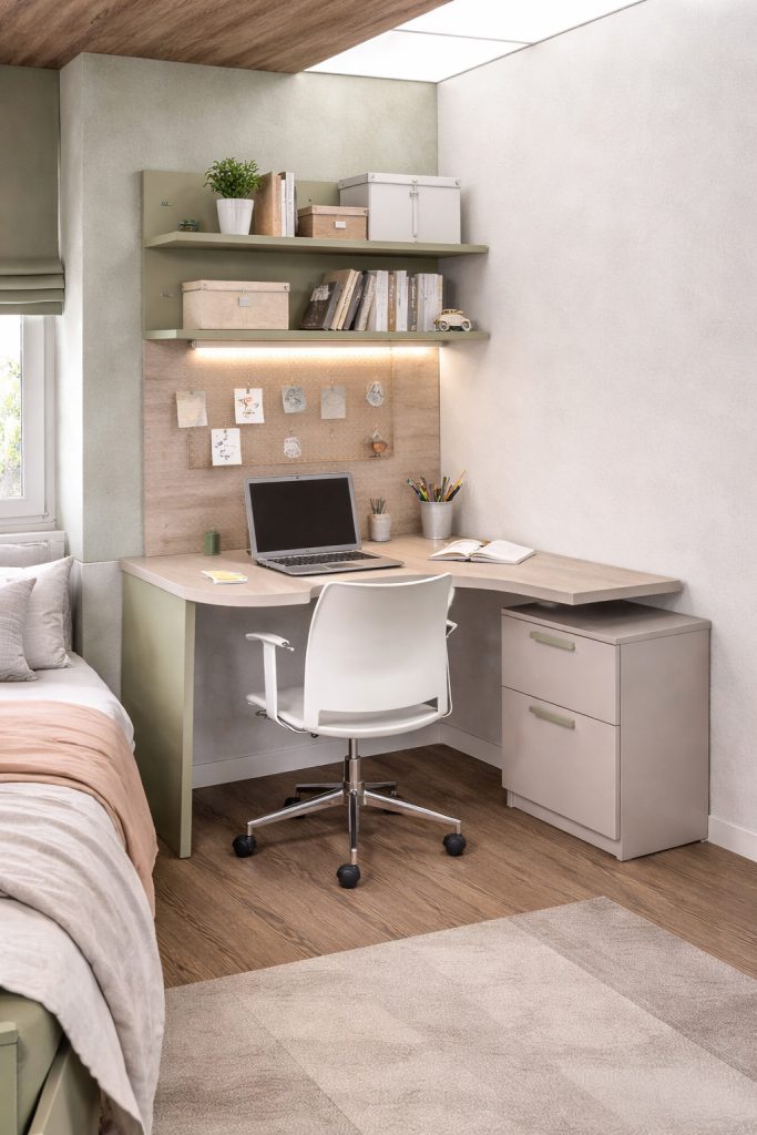Un angolo inutilizzato può diventare una postazione perfetta: mensole sospese + piano ribassato + illuminazione adeguata. Anche sotto un letto a soppalco o con cassettoni si può ricavare uno spazio studio.