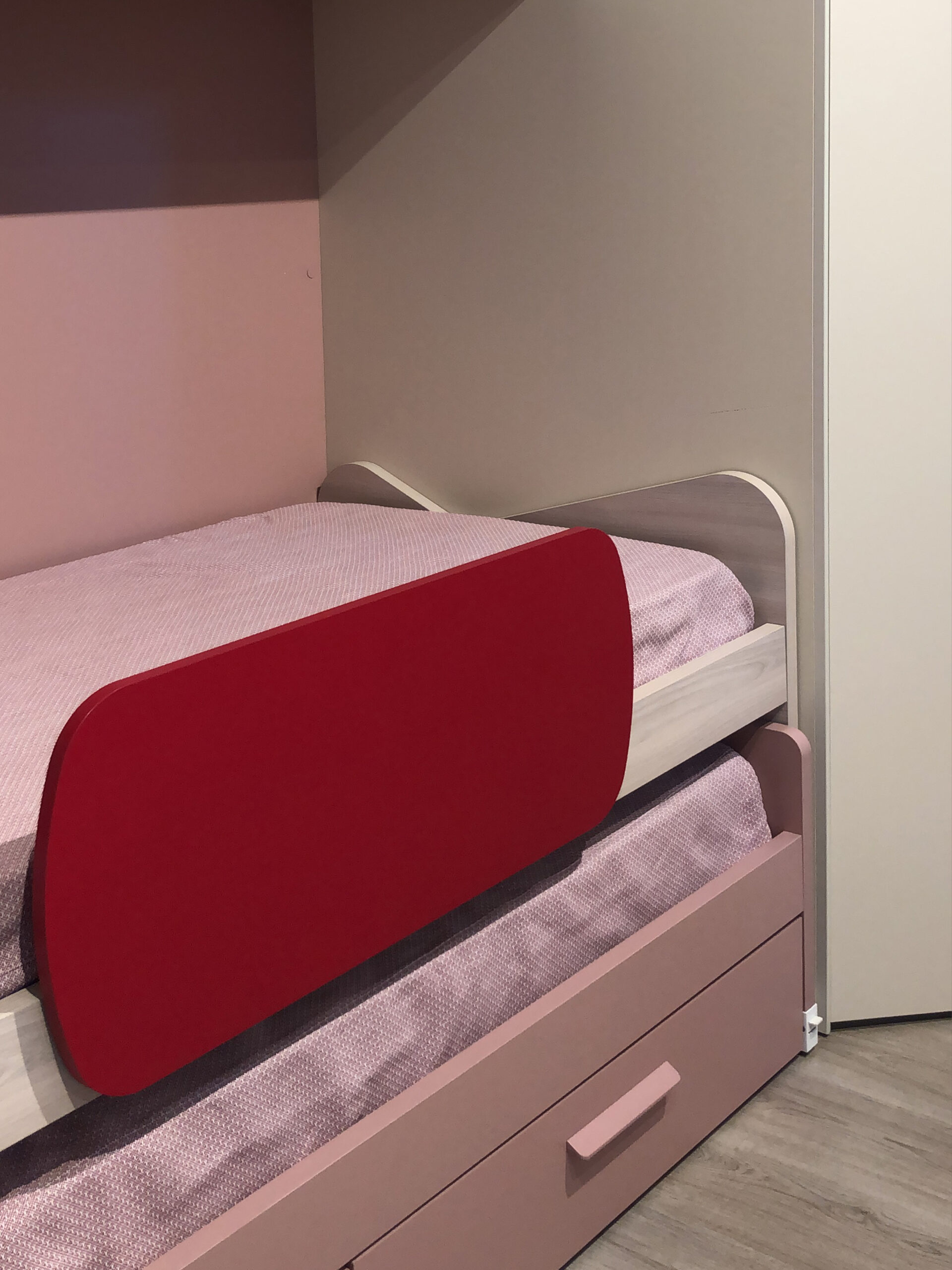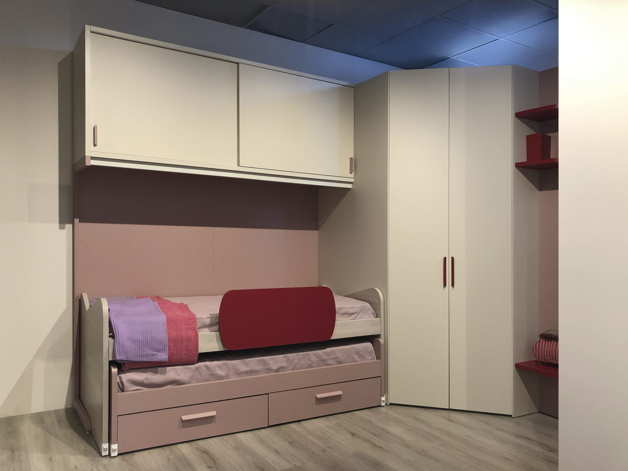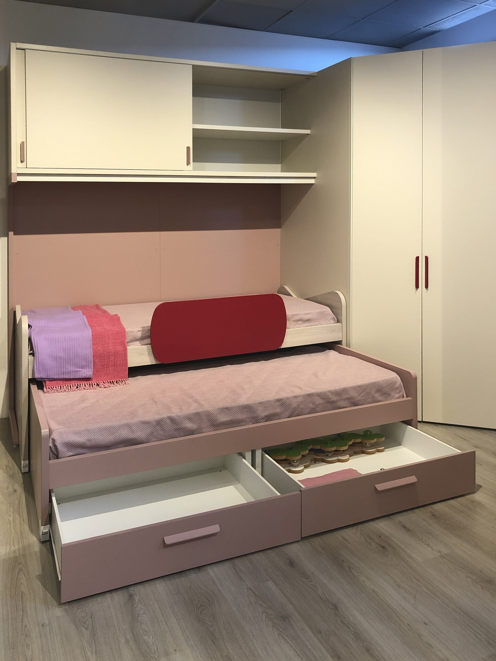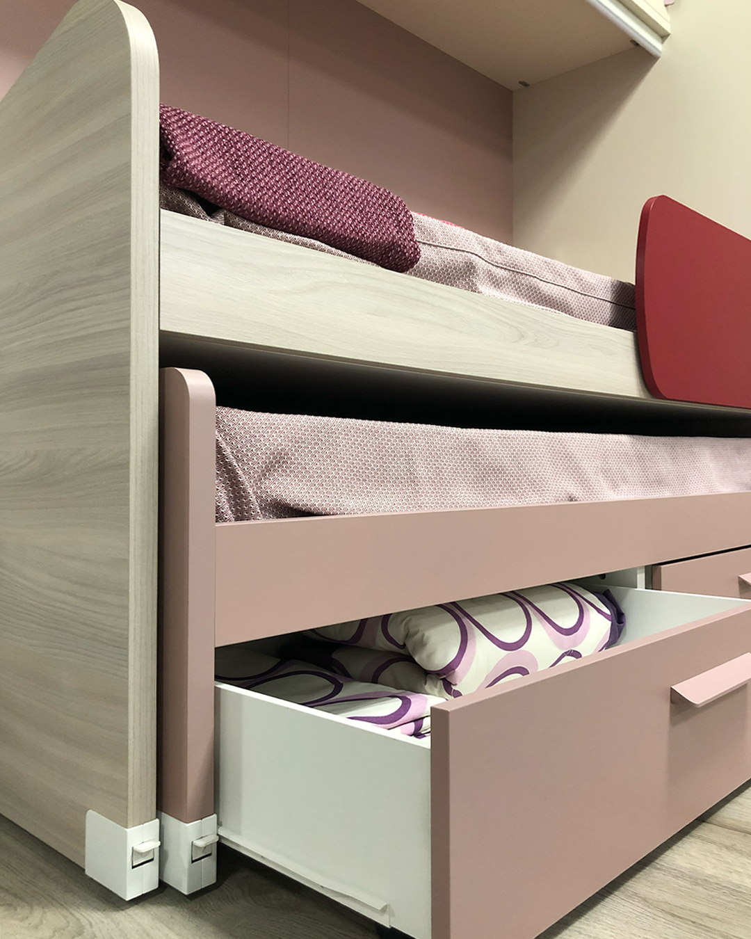 - Struttura: letto singolo in posizione rialzata, con al di sotto un secondo letto singolo (estraibile) e 2 cassetti