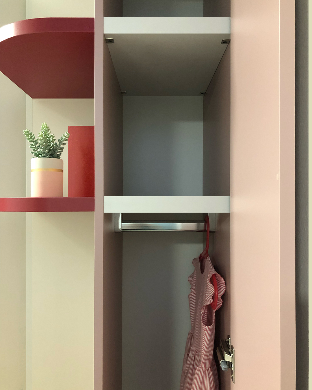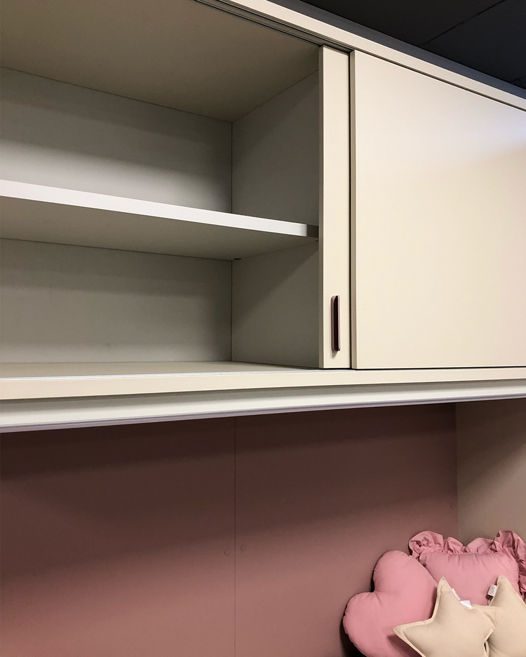 Sopra i letti si trova un pratico armadio pensile, le cui ante scorrevoli offrono ulteriore spazio senza ingombrare la stanza. Le maniglie laccate rosa dalia aggiungono un dettaglio raffinato che completa il look complessivo della cameretta.