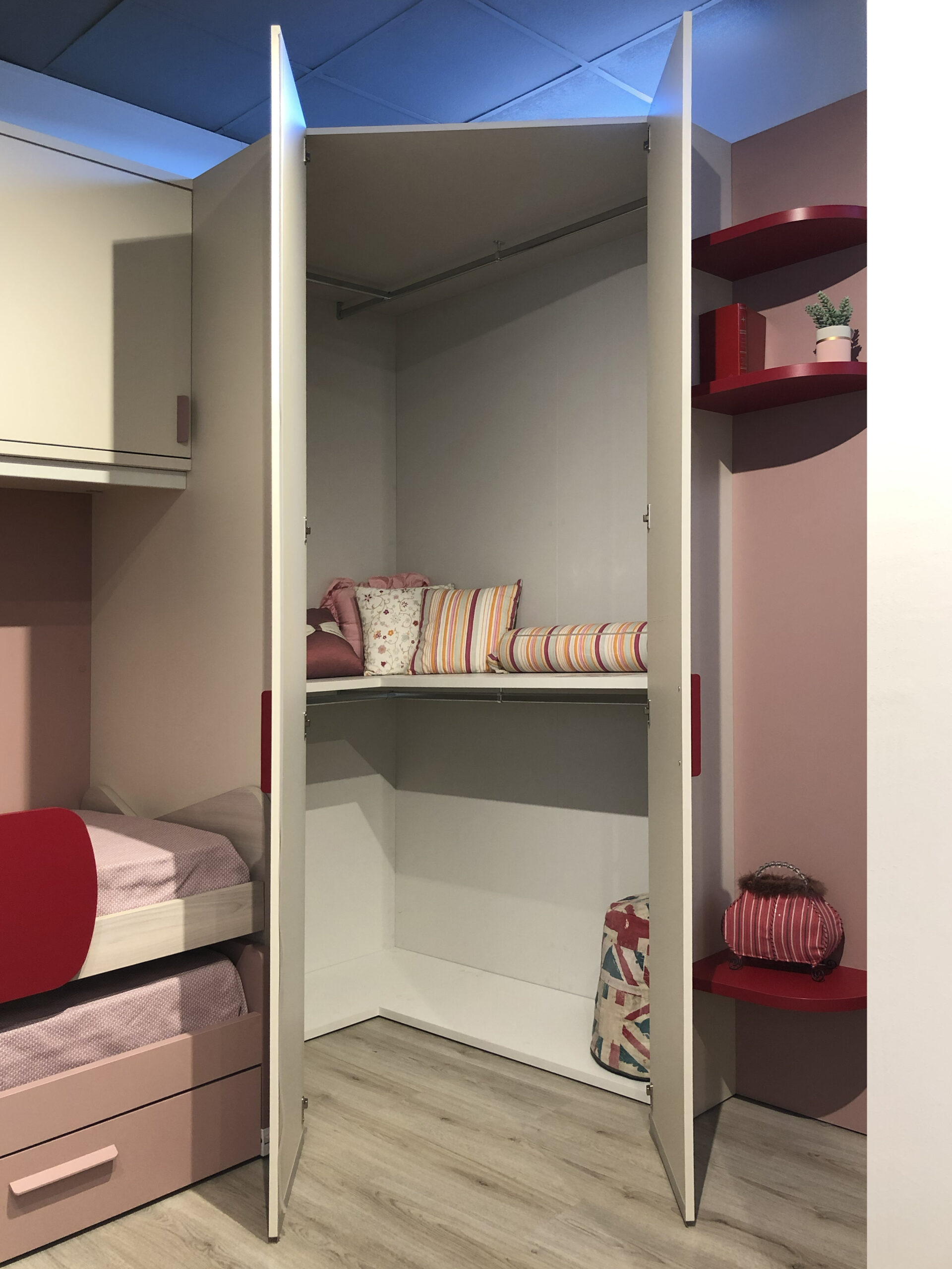 - Struttura: armadio a due ante scorrevoli, pensile e posto sopra i due letti, + una ampia cabina armadio posta all’angolo della cameretta + terminale con anta battente singola e mensole con funzione libreria