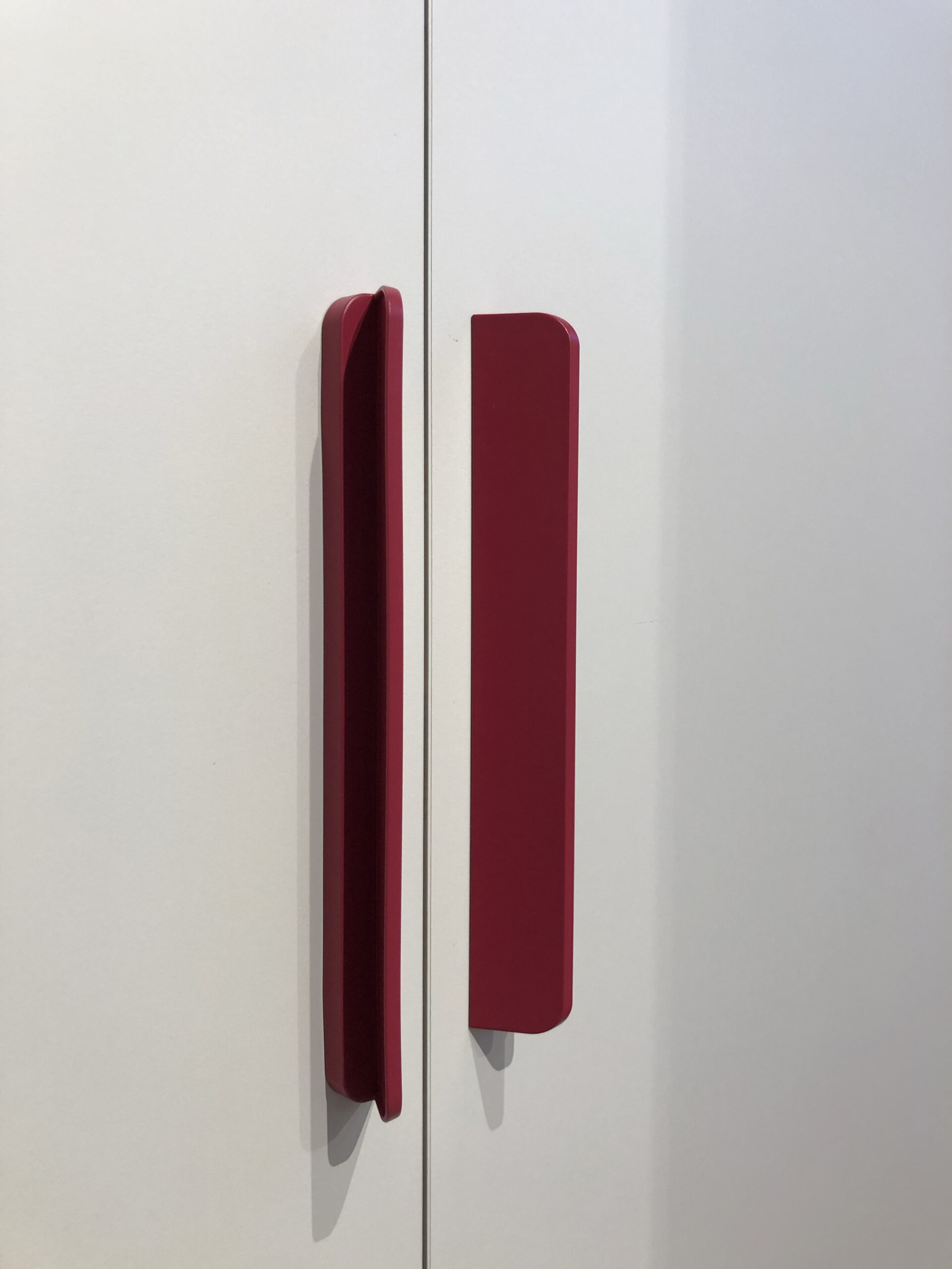 - Armadio Pensile: la struttura e le 2 ante scorrevoli sono in melaminico beige, le maniglie sono in metallo laccato rosa dalia