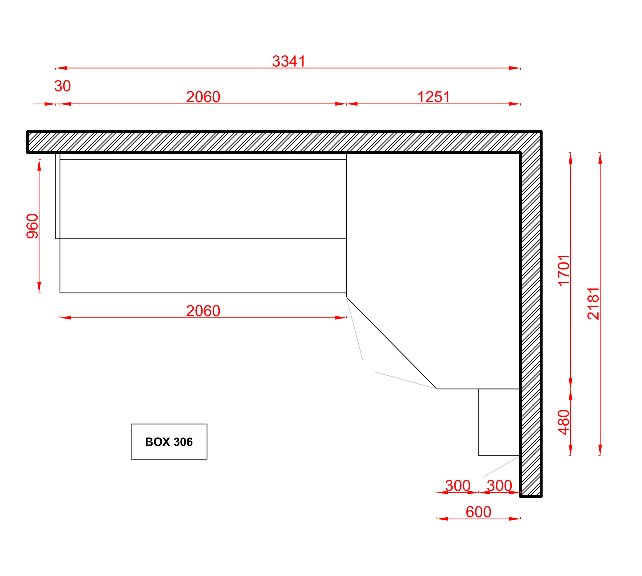 - Terminale: l’elemento con anta battente è in melaminico dalia con maniglia in metallo laccato bordeaux, le 3 mensole esterne con angolo arrotondato sono in melaminico bordeaux