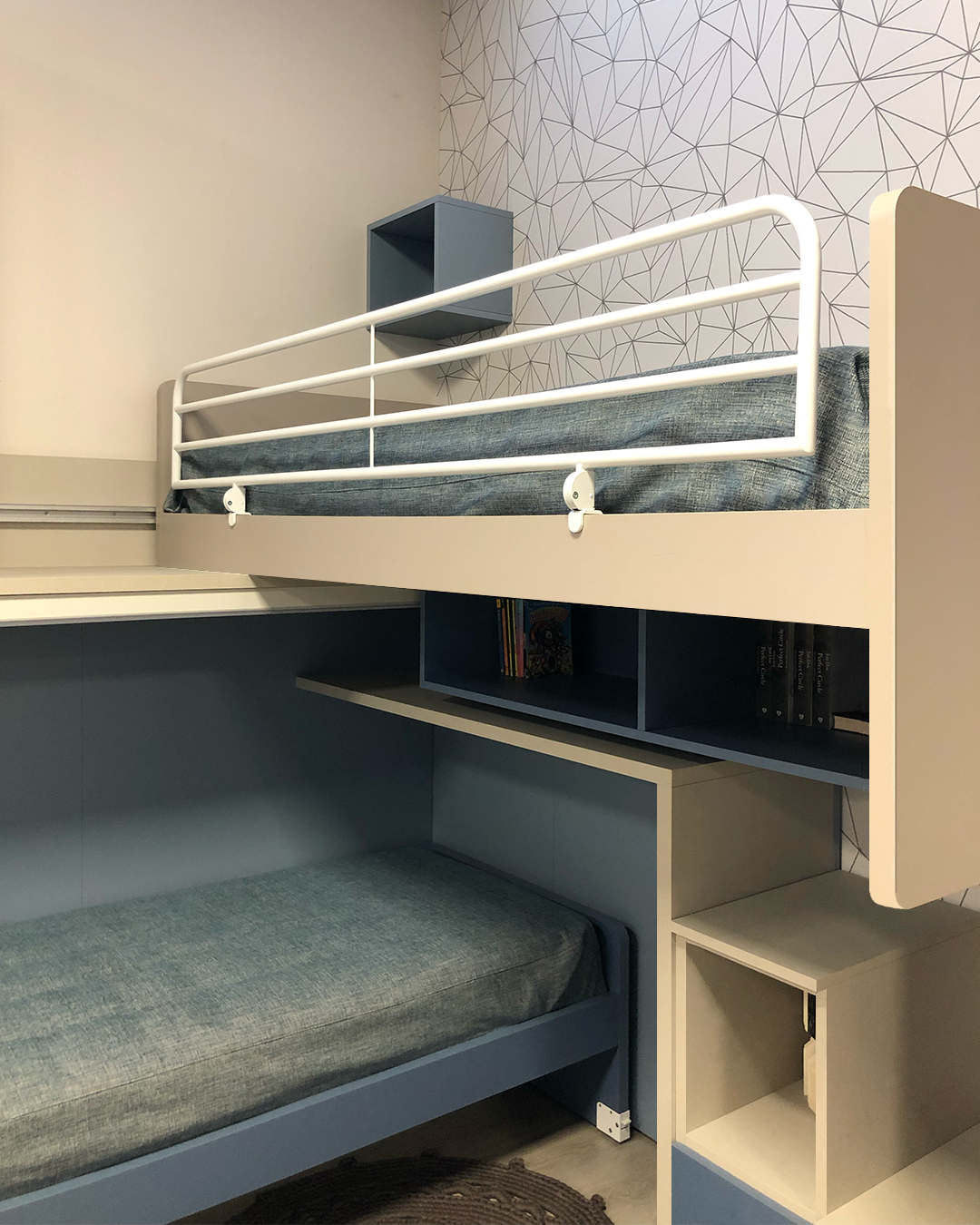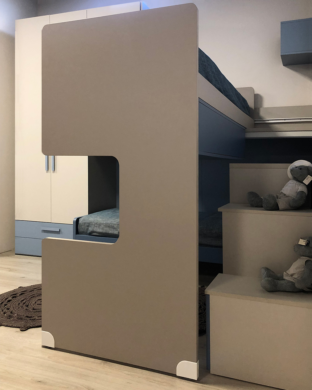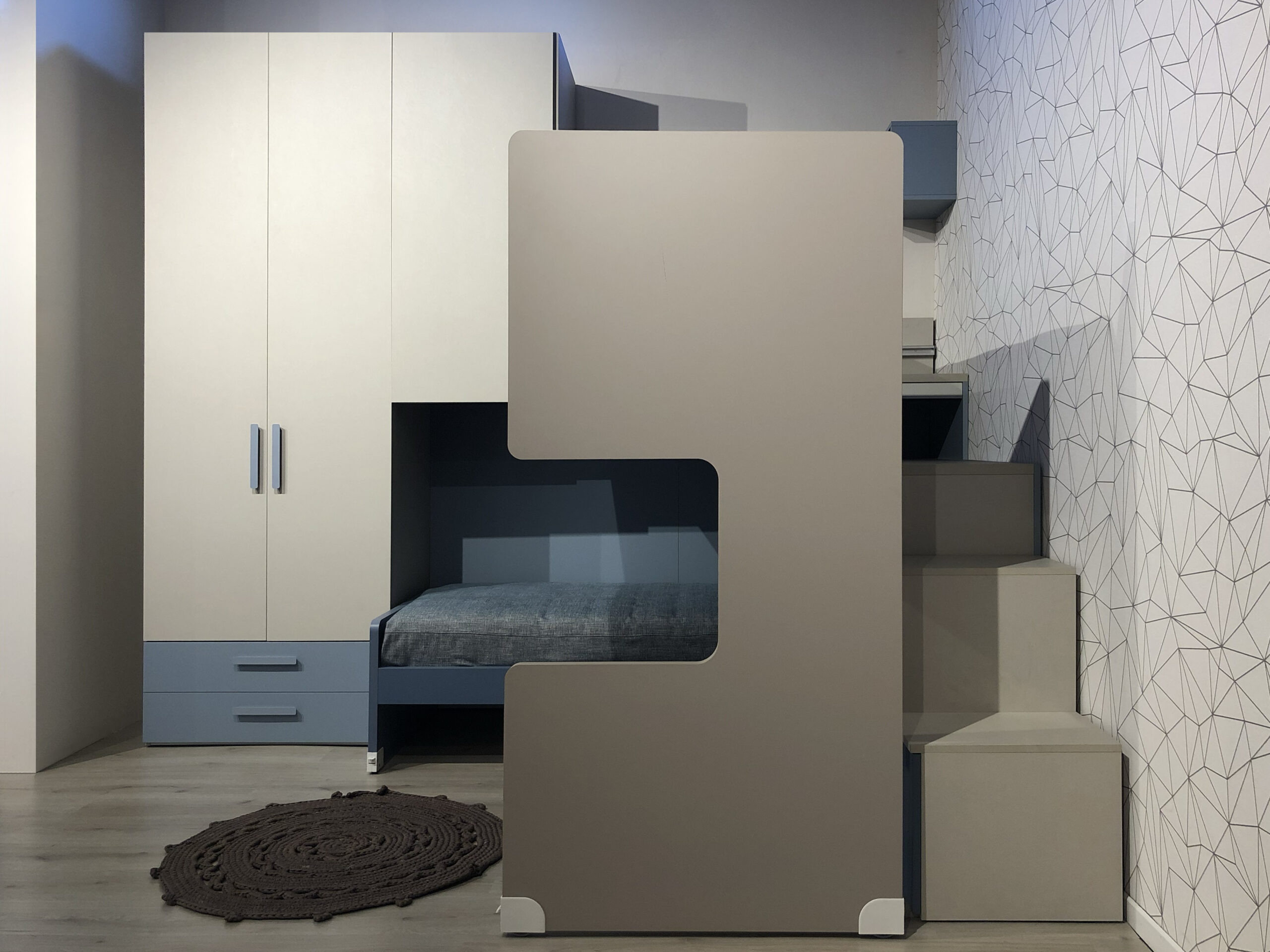 Il soppalco, rifinito in melaminico tortora, si muove facilmente avanti e indietro, rivelando una comoda scaletta a gradoni che permette di accedere al letto superiore.