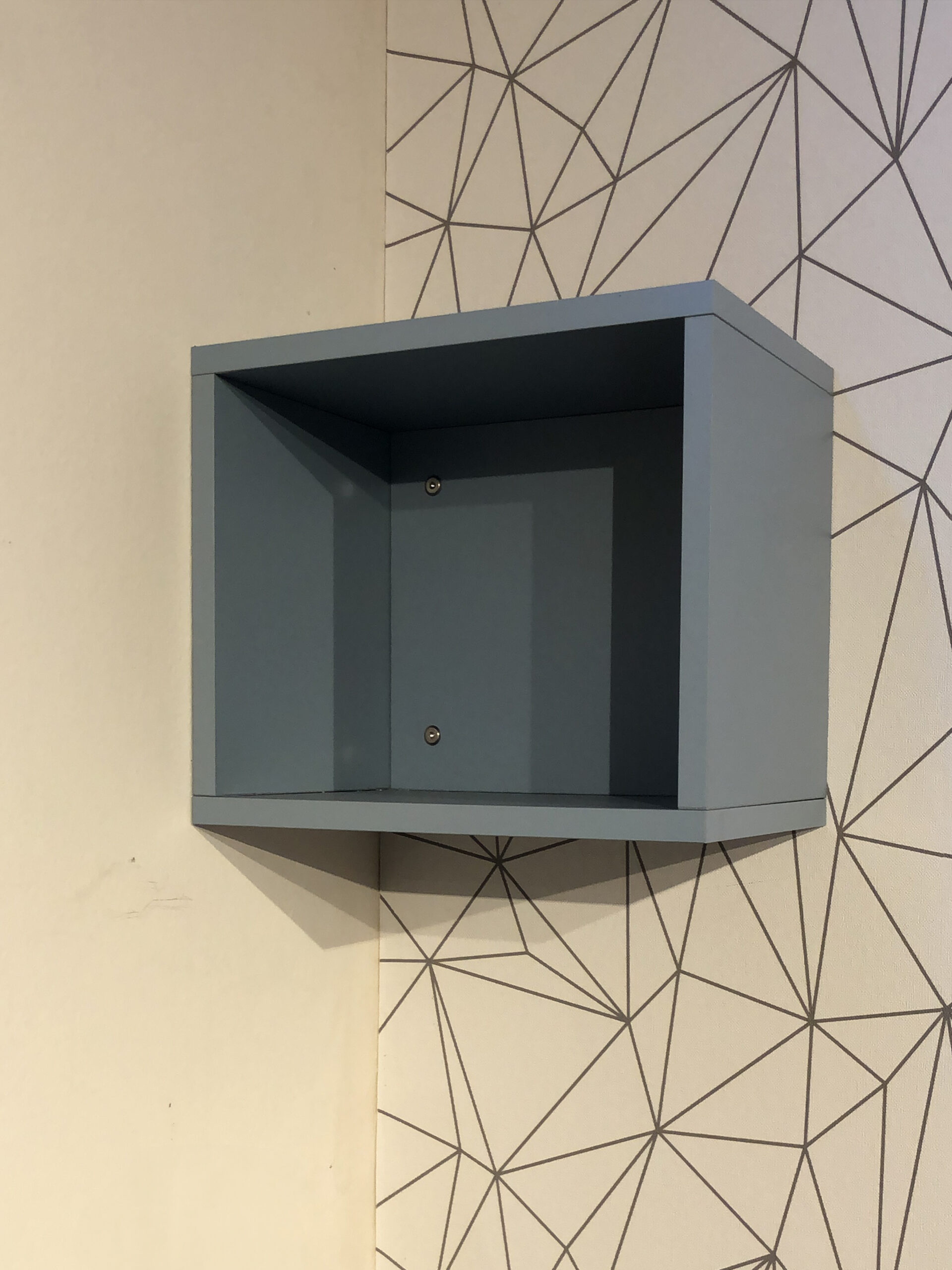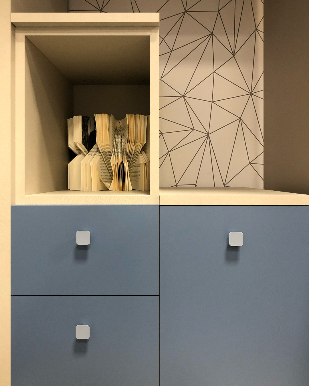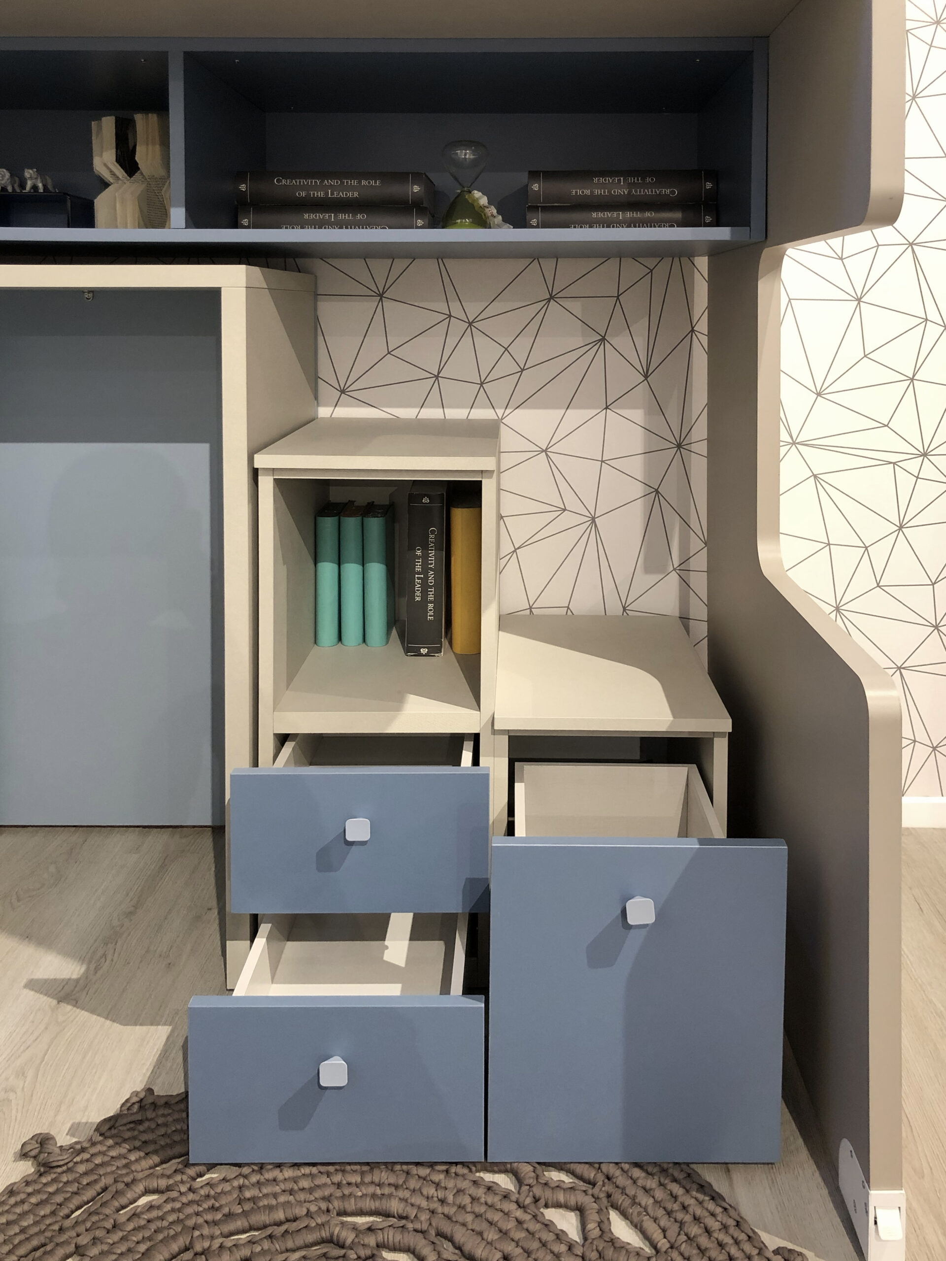 - Attrezzatura Sotto al Soppalco: a terra troviamo una piccola cassettiera in melaminico blu cobalto con 2 cassetti e 1 cestone + 1 vano a giorno in melaminico beige, sospesi troviamo 3 vani a giorno con funzione libreria, 2 in melaminico blu cobalto e 1 in melaminico beige