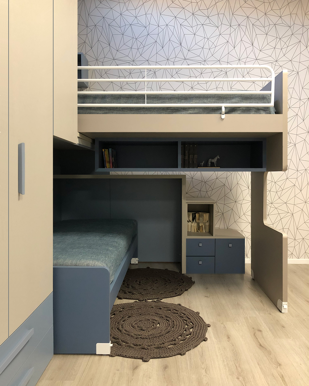 Questa composizione si distingue per l’uso intelligente dello spazio, con un letto singolo a terra e un secondo letto posizionato sopra un pratico soppalco scorrevole.