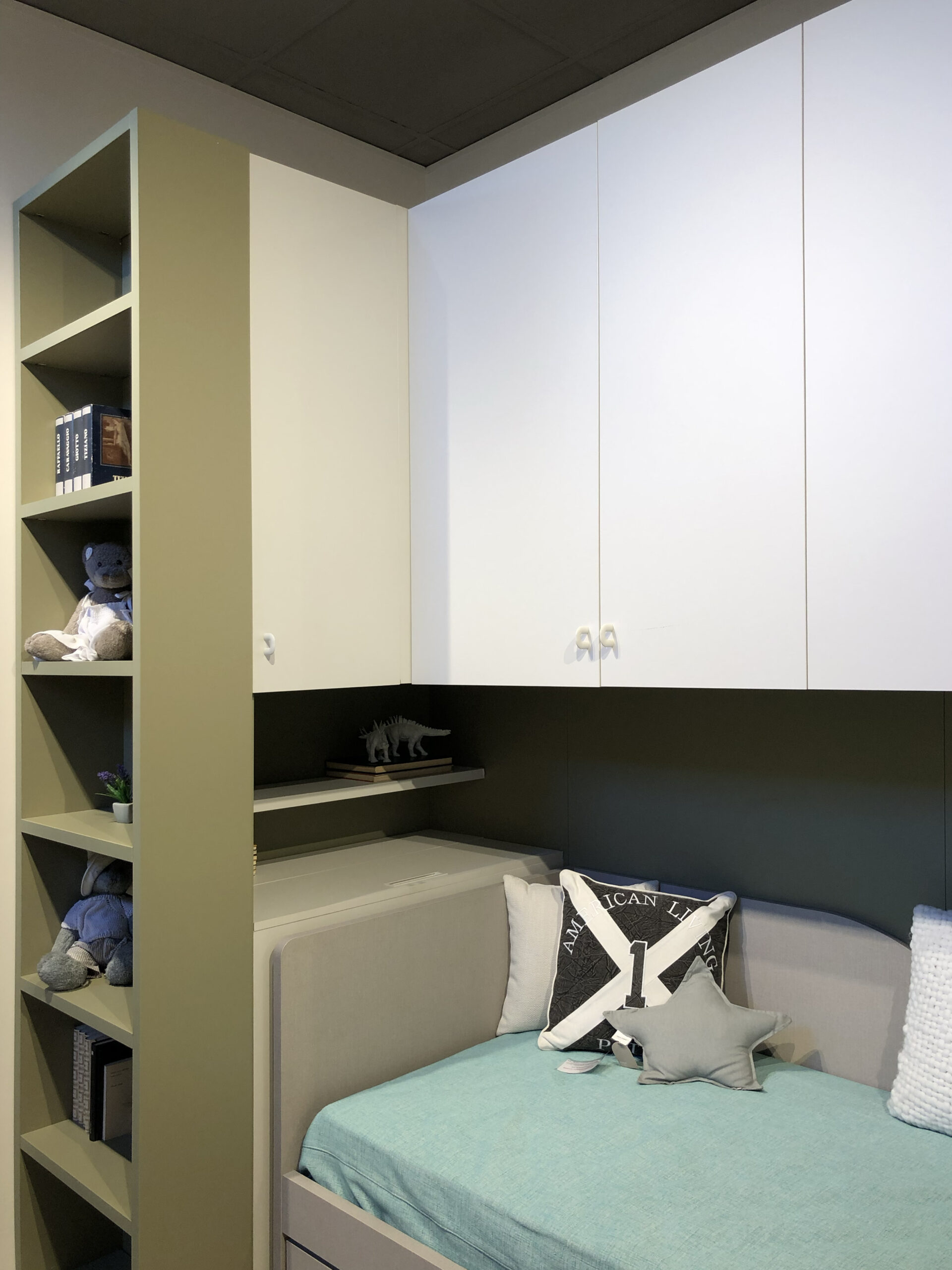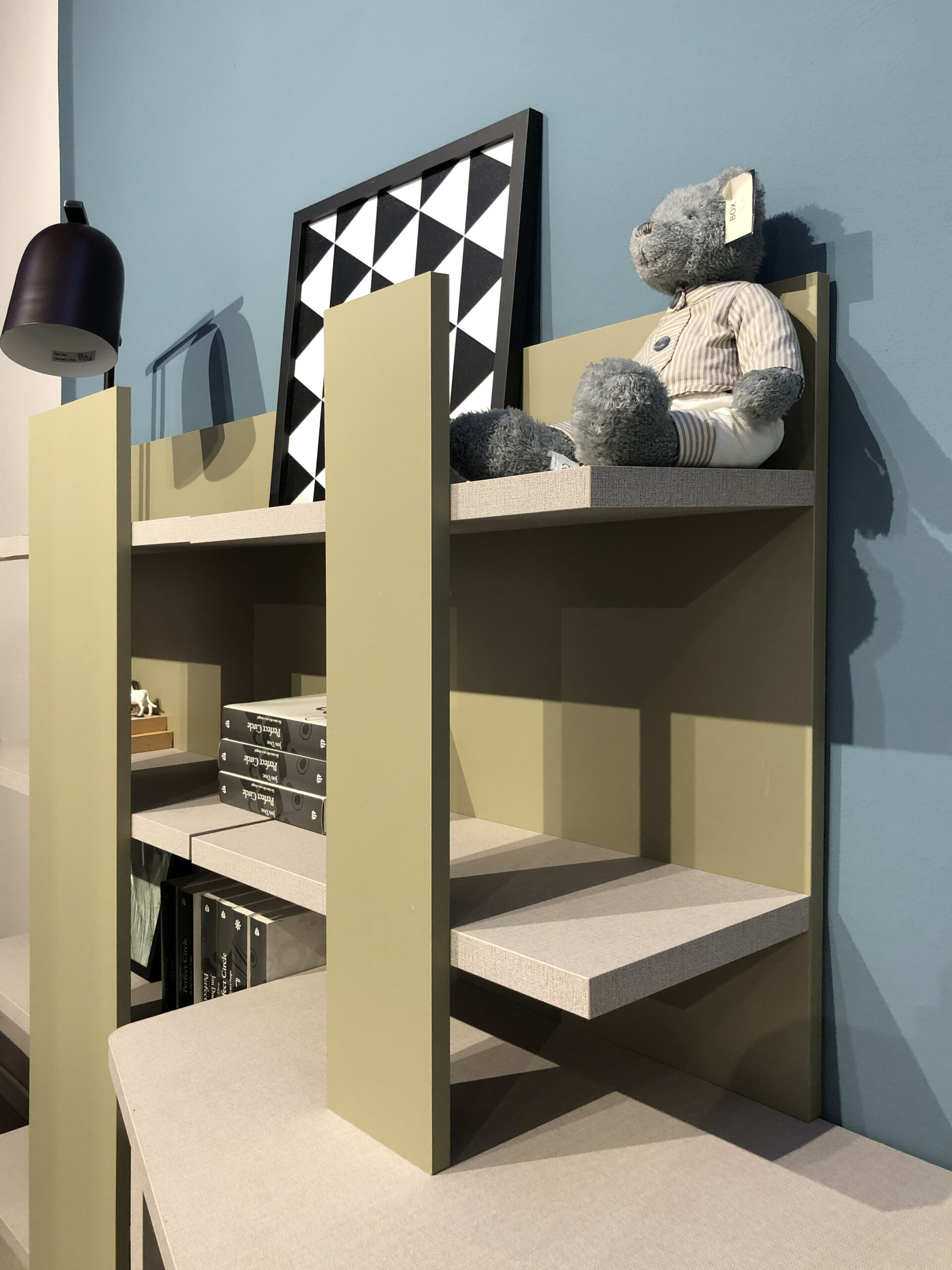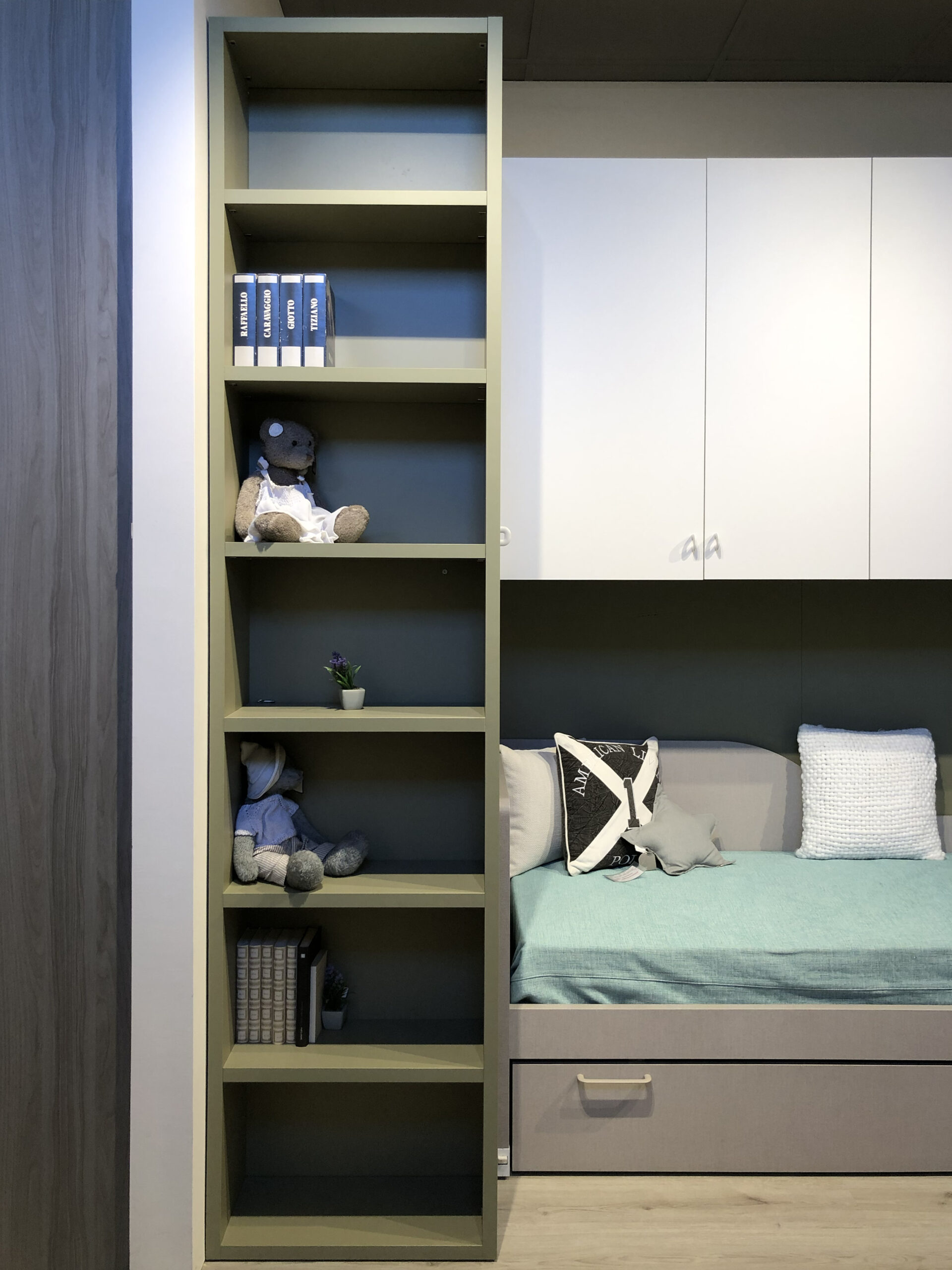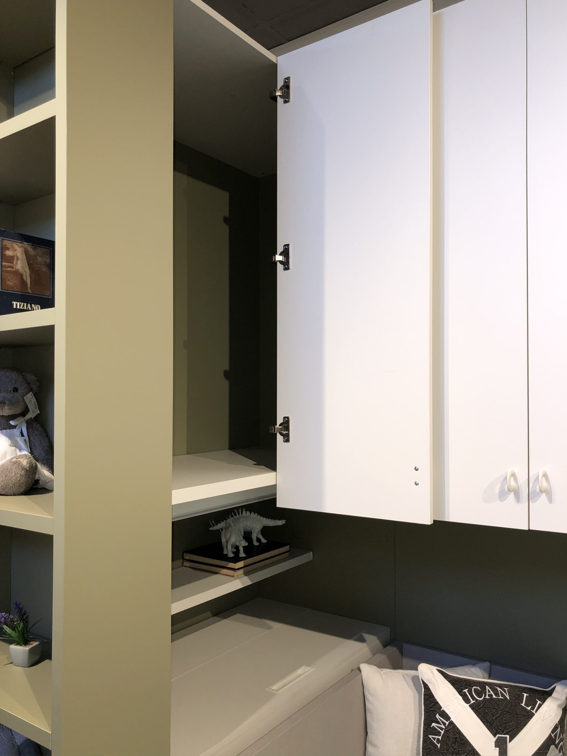 L’elemento distintivo è il terminale libreria, posizionato sul lato corto dell’armadio angolare a ponte. Con sette ripiani a giorno in melaminico salvia, è perfetto per esporre libri o oggetti decorativi.