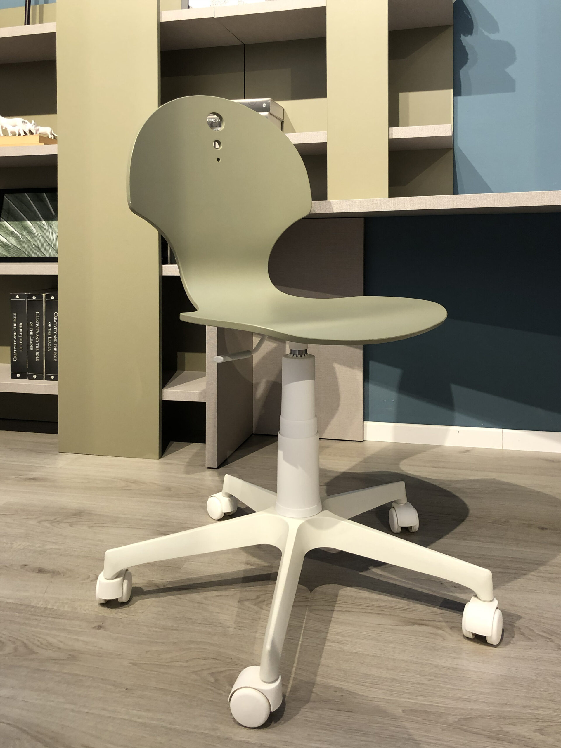 A completare l’arredamento c’è una sedia ergonomica in polipropilene verde salvia, dotata di basamento in metallo bianco e rotelle bianche, che assicura comfort durante le ore di studio o lavoro.