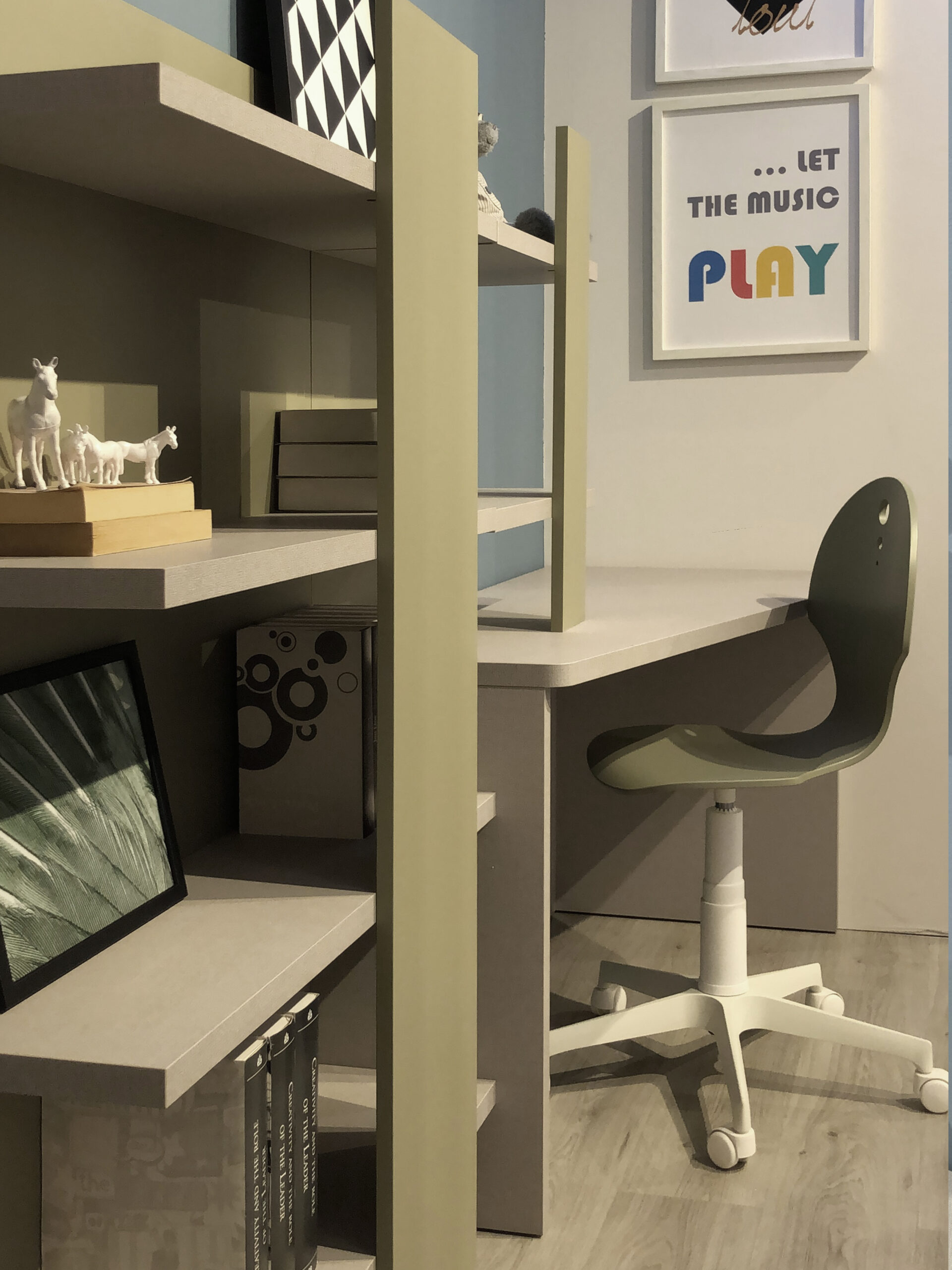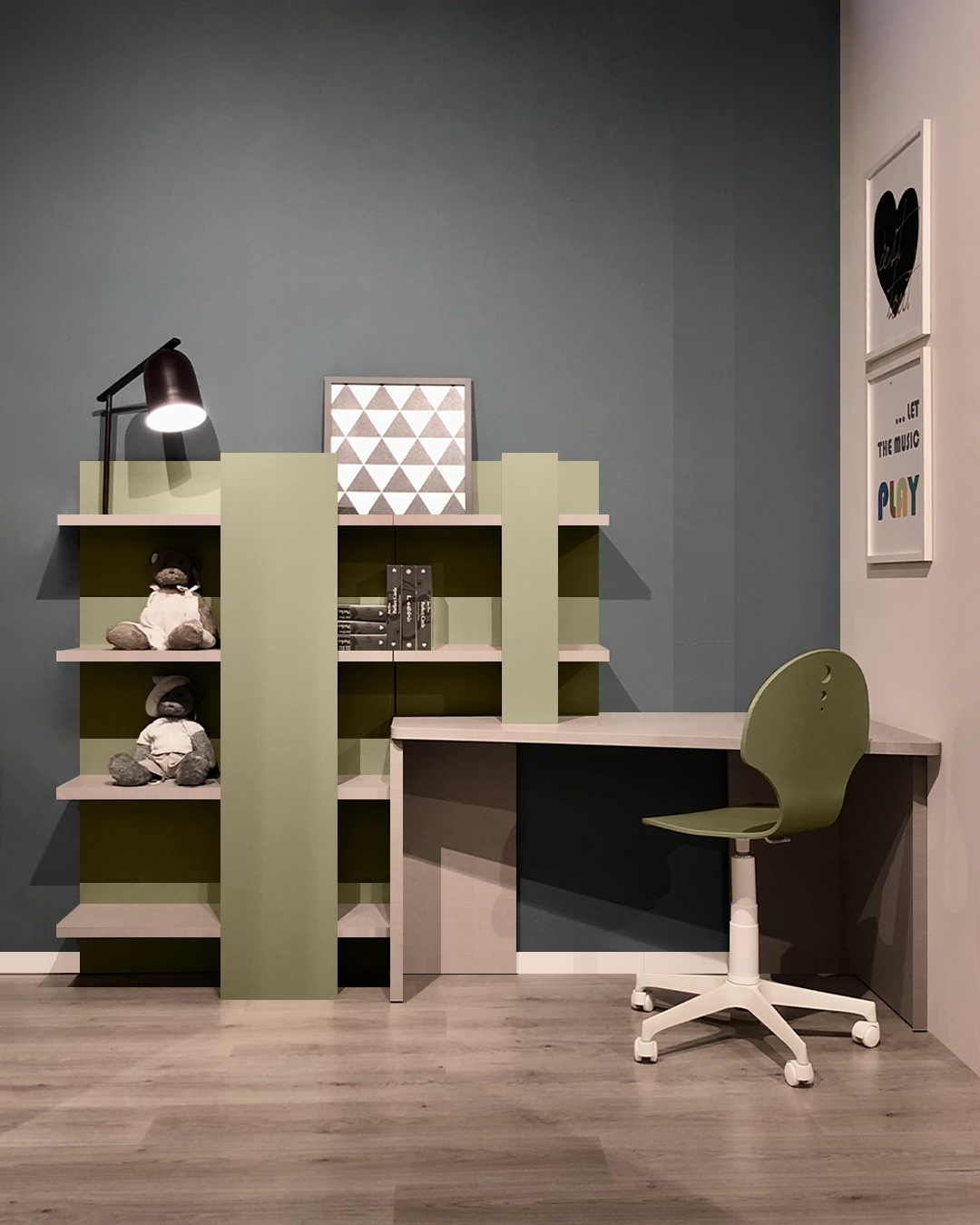 Ad arricchire la composizione troviamo una libreria con scrivania integrata. Lo schienale in melaminico salvia e i ripiani in melaminico dekor cotone creano un ambiente di studio funzionale ed esteticamente piacevole.