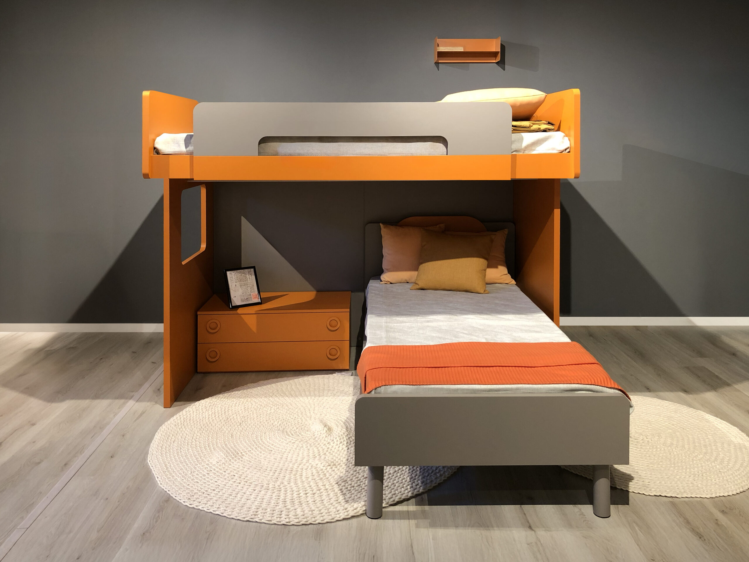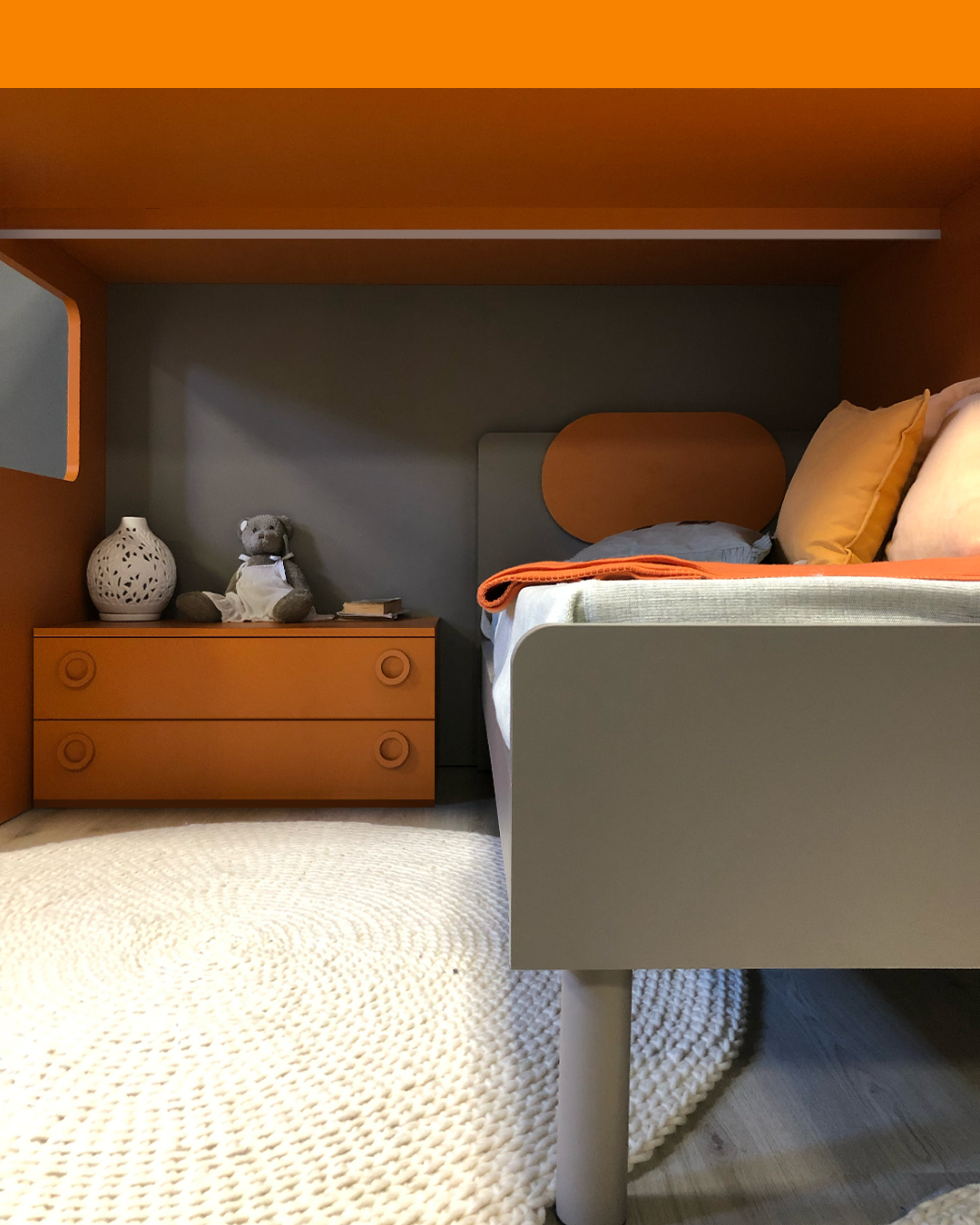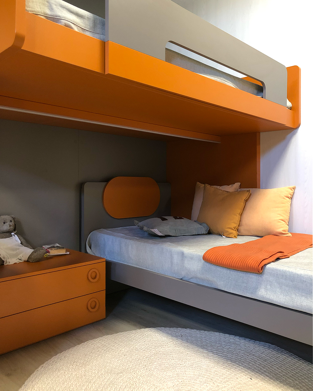 Con una combinazione di colori vivaci come il grigio, l’arancio paprika e il bianco, questa cameretta non solo ottimizza lo spazio ma aggiunge un tocco di stile moderno alla stanza dei più piccoli.