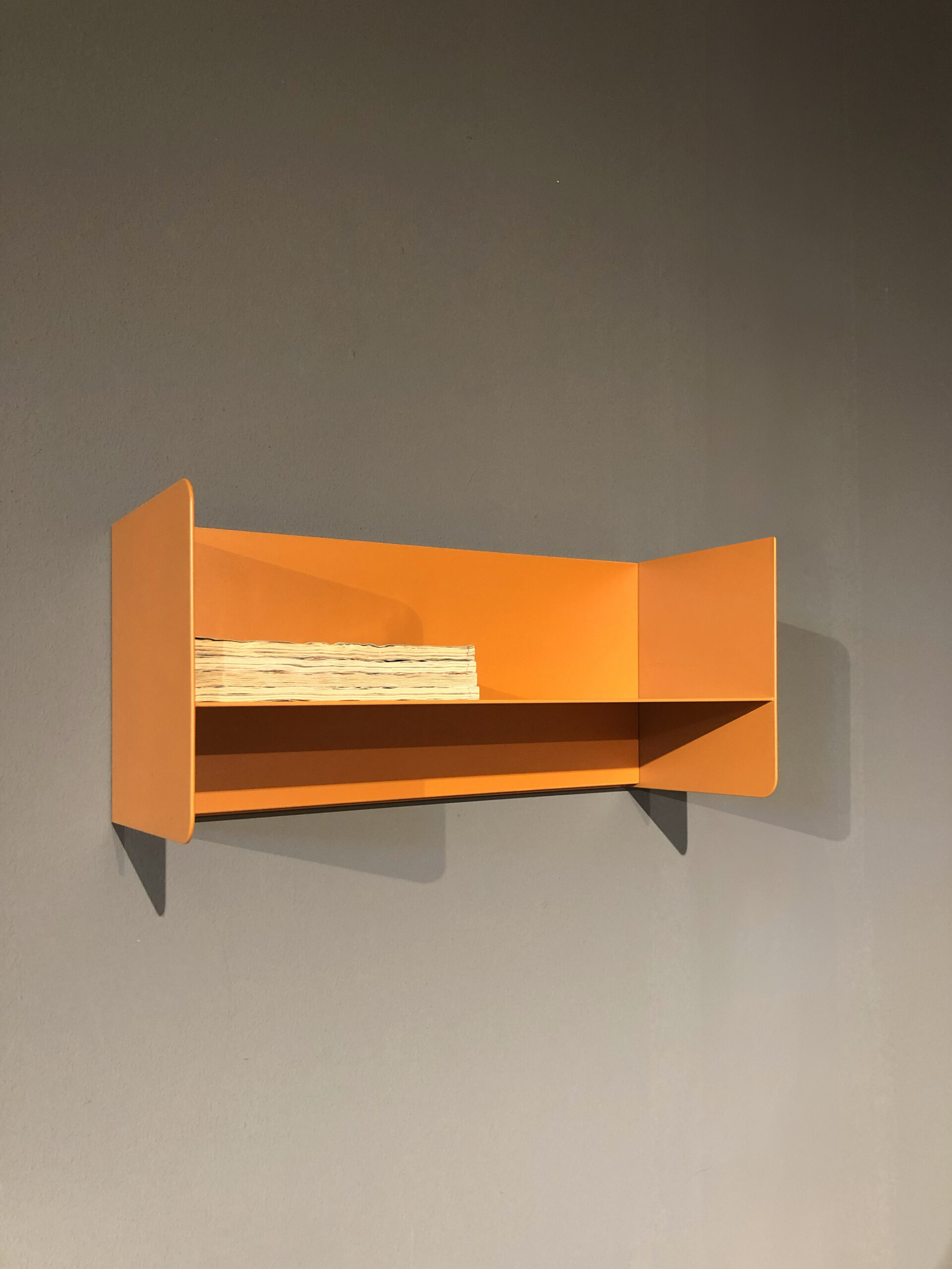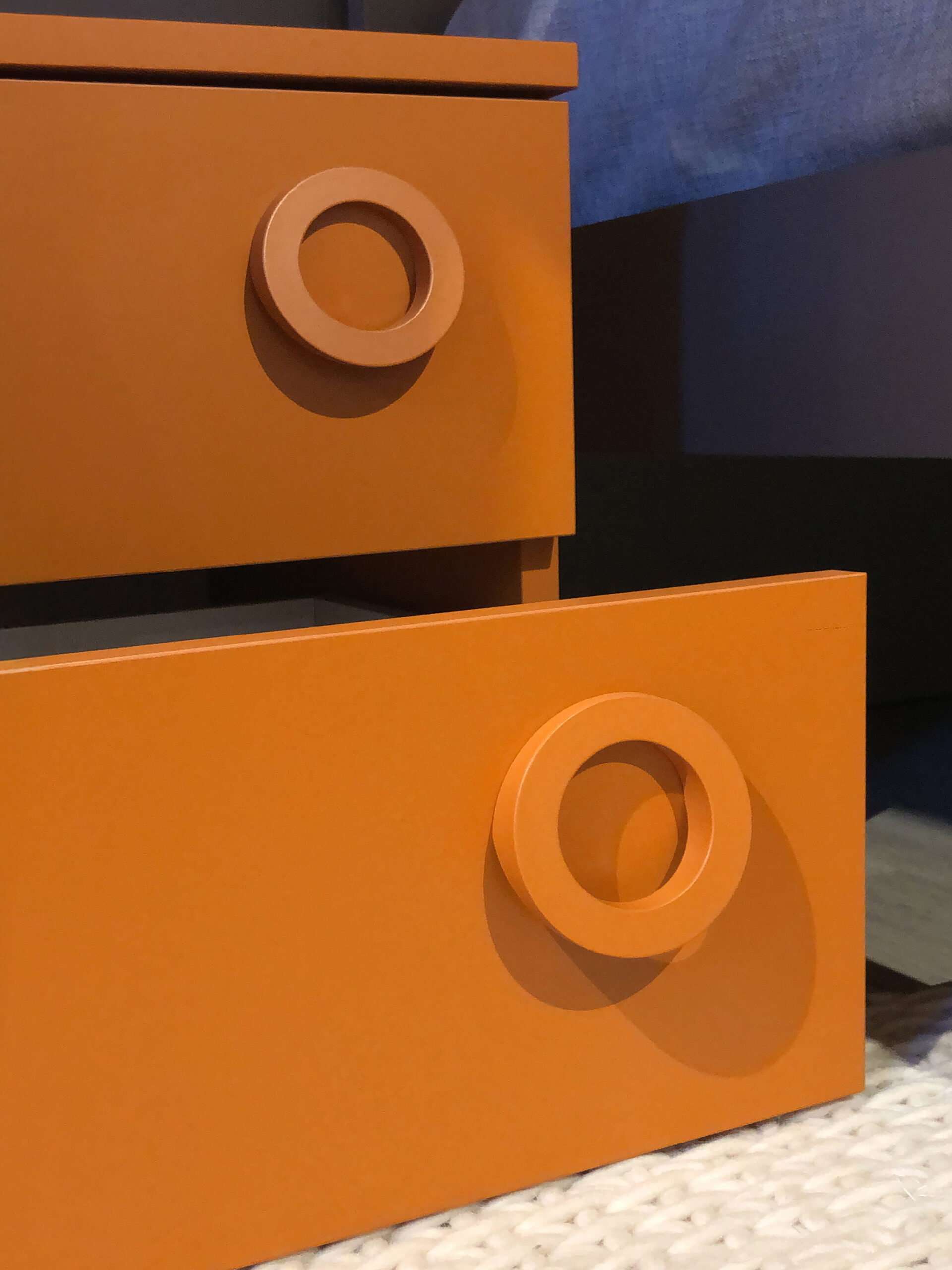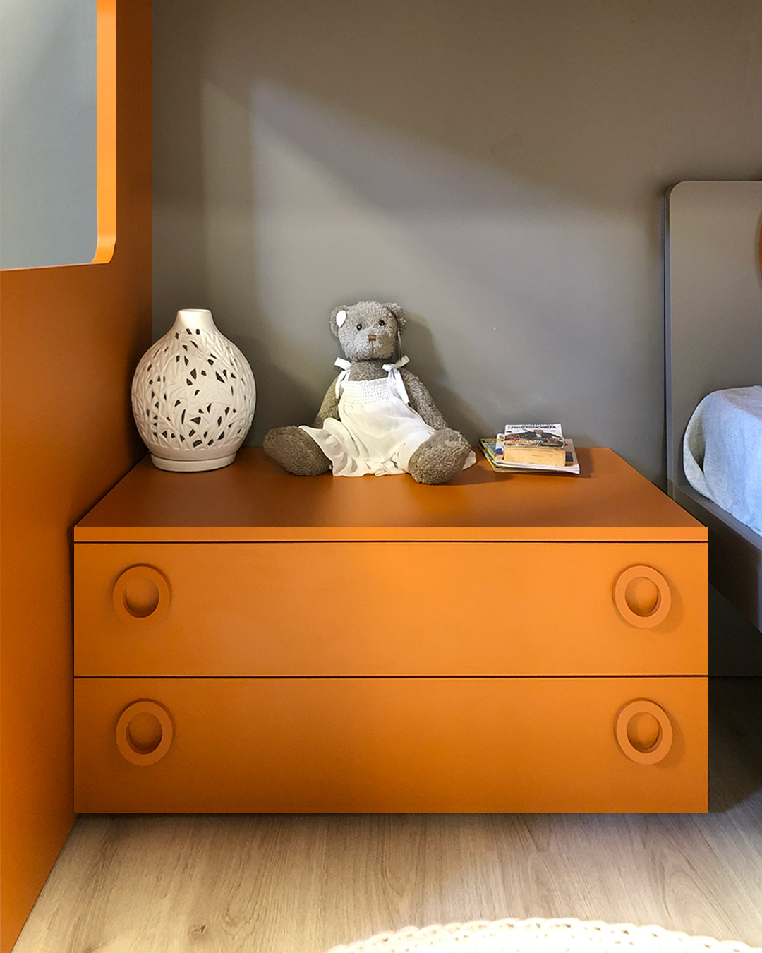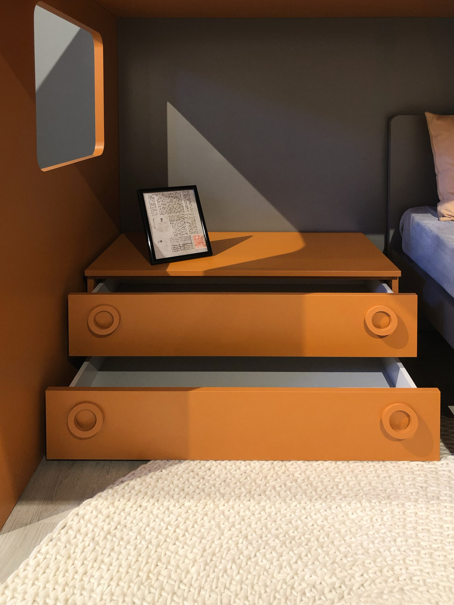 Il comodino, anch’esso in arancio paprika, offre due cassetti spaziosi con maniglie tonde arancioni che aggiungono un ulteriore tocco di colore e funzionalità.