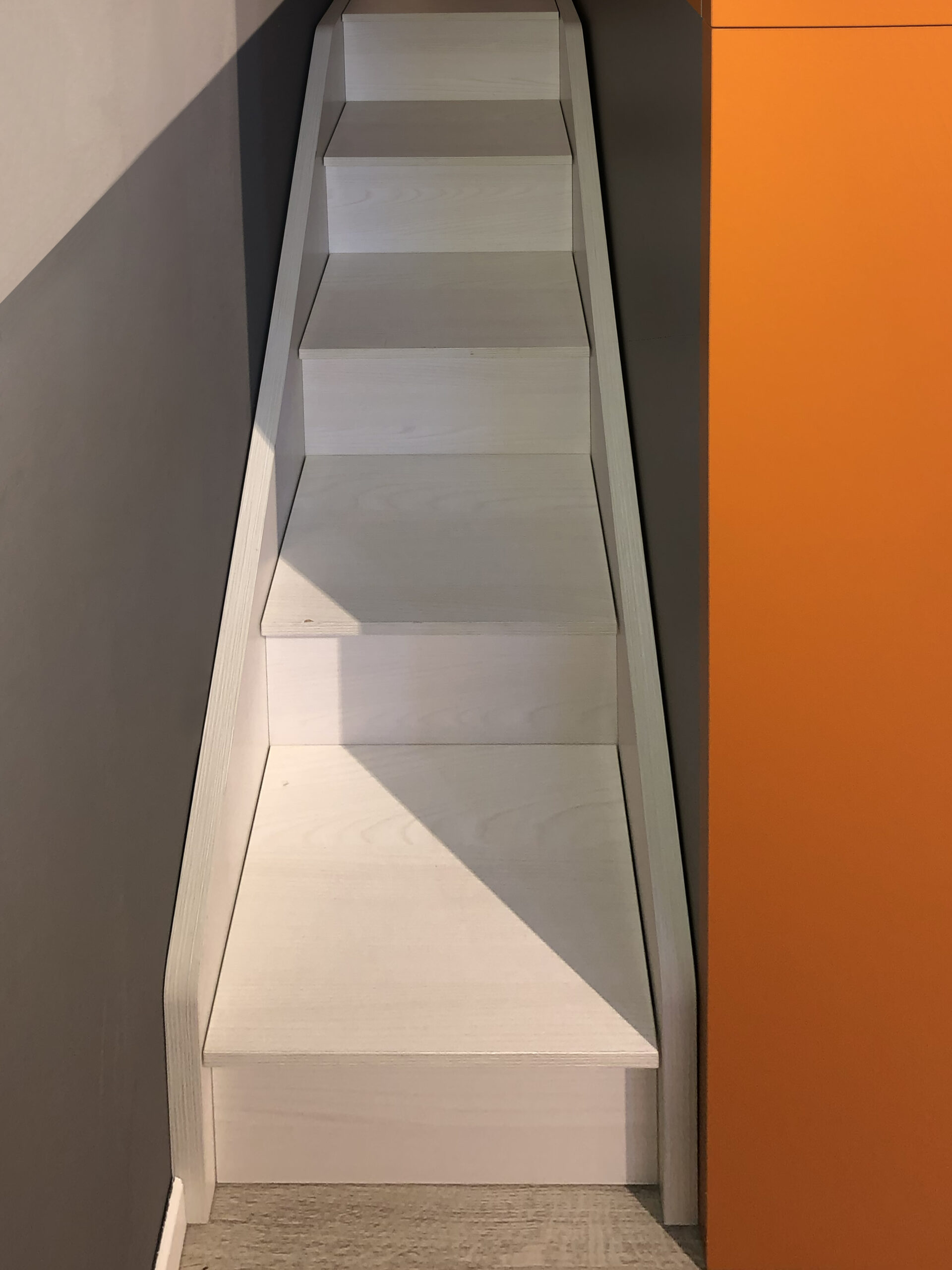 - Scaletta per Raggiungere il Letto Superiore: melaminico materico olmo sbiancato, a gradoni con vano contenitore in cima alla scaletta stessa
