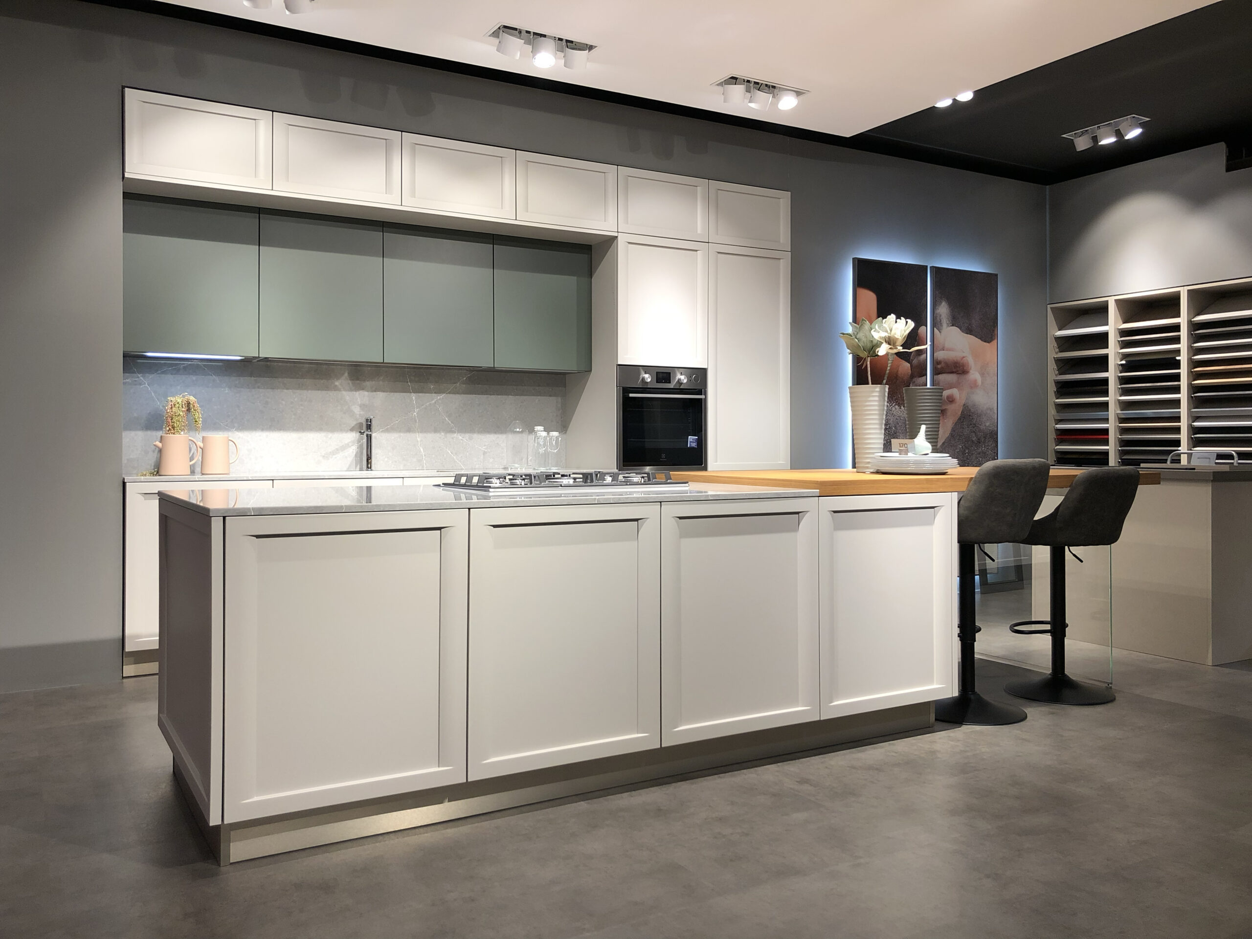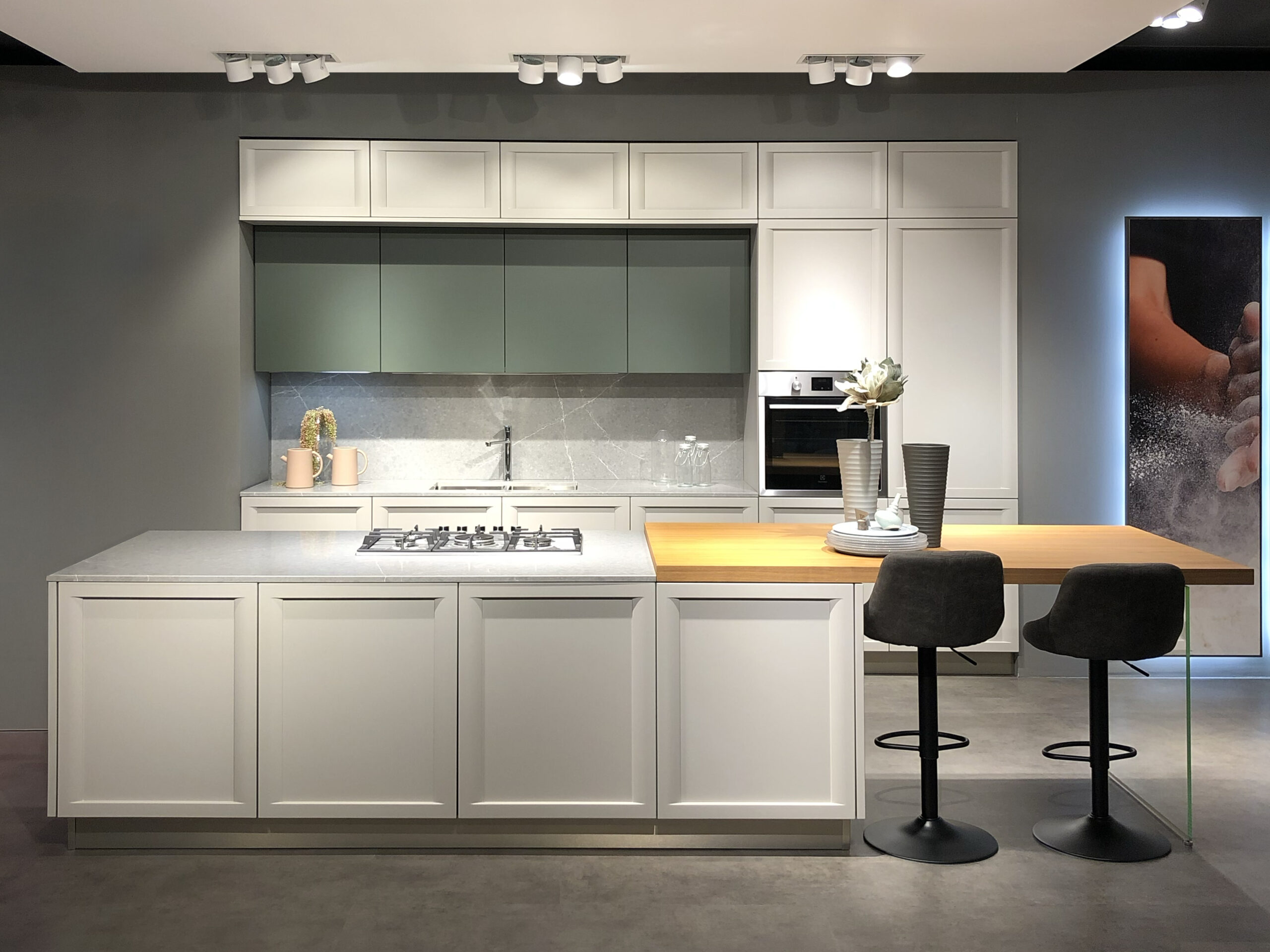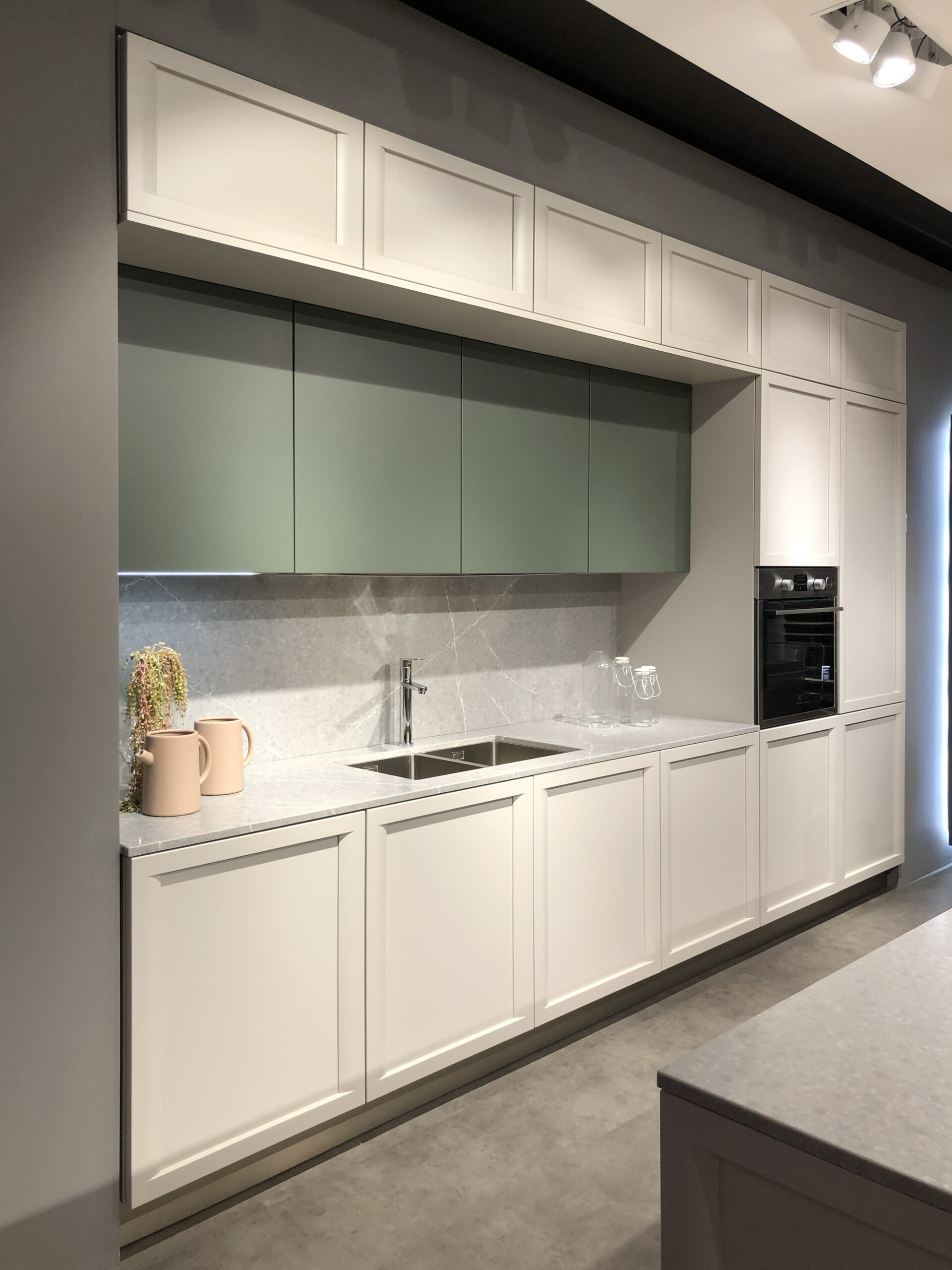I pensili superiori in laccato opaco Verde Timo si alternano alle colonne e alle basi in laccato opaco Bianco Neve, creando un raffinato gioco cromatico che esalta la pulizia visiva dell’insieme. Il sistema di apertura con maniglia integrata permette di mantenere un’estetica essenziale e ordinata, senza rinunciare alla praticità quotidiana.