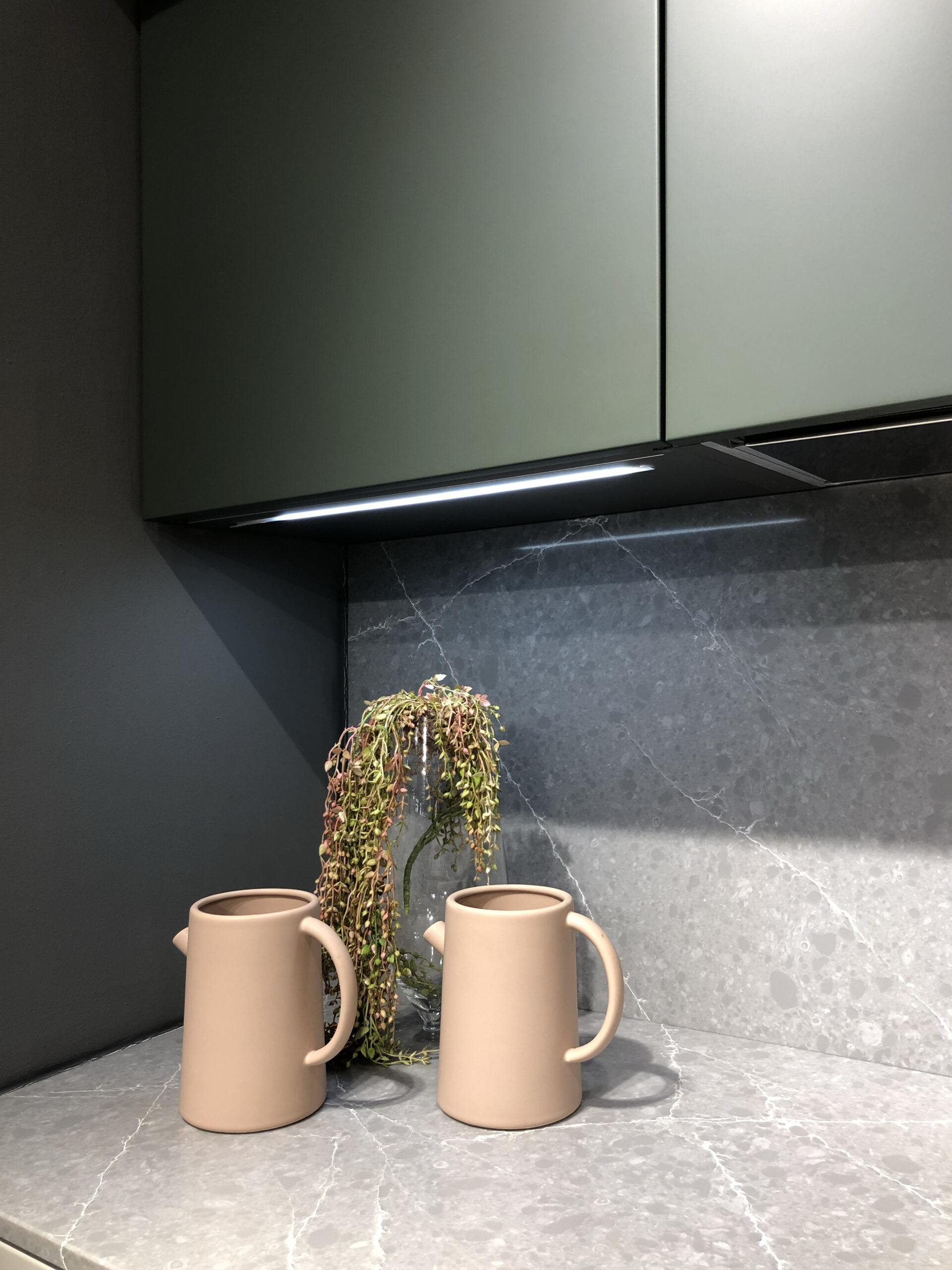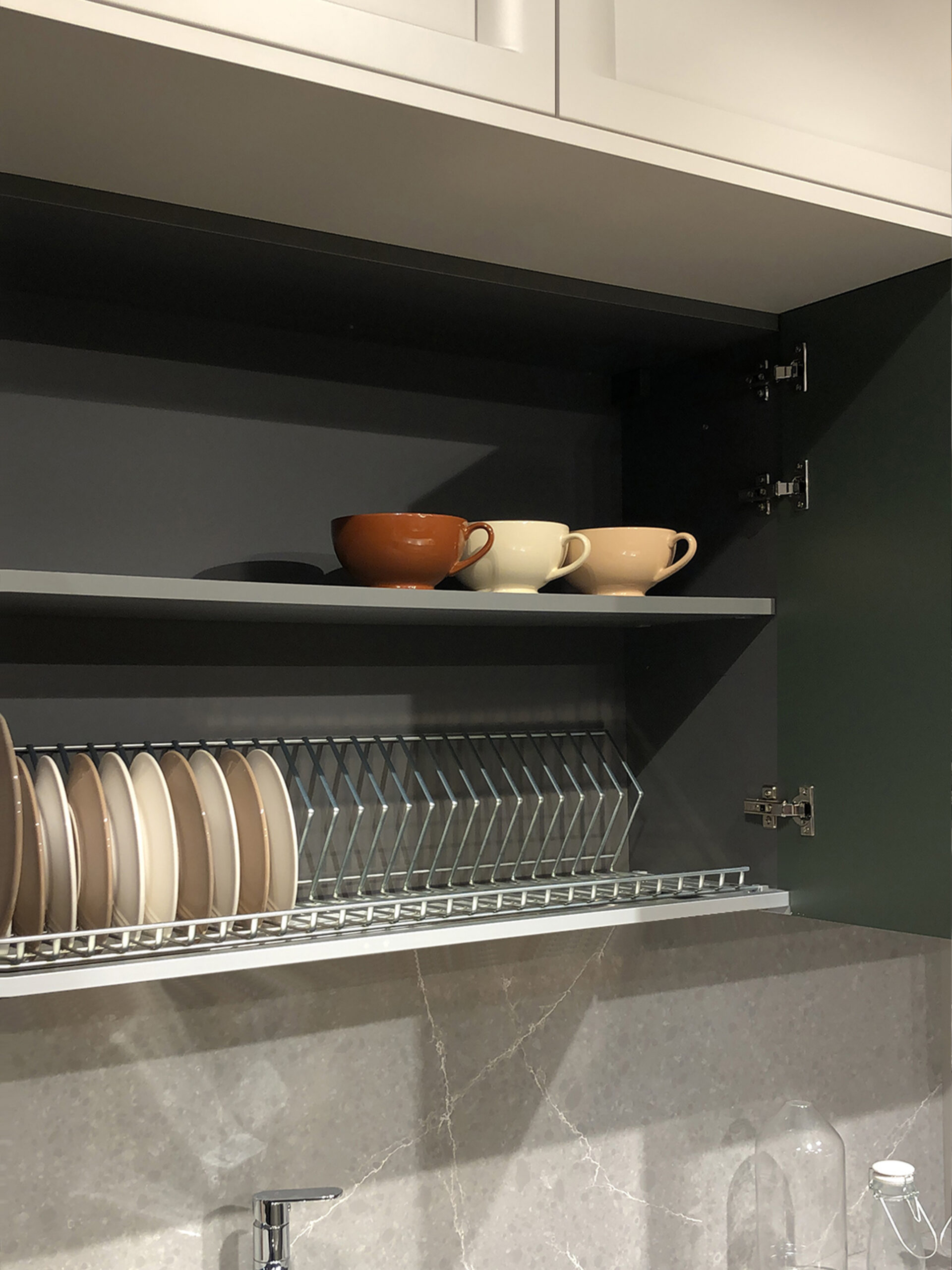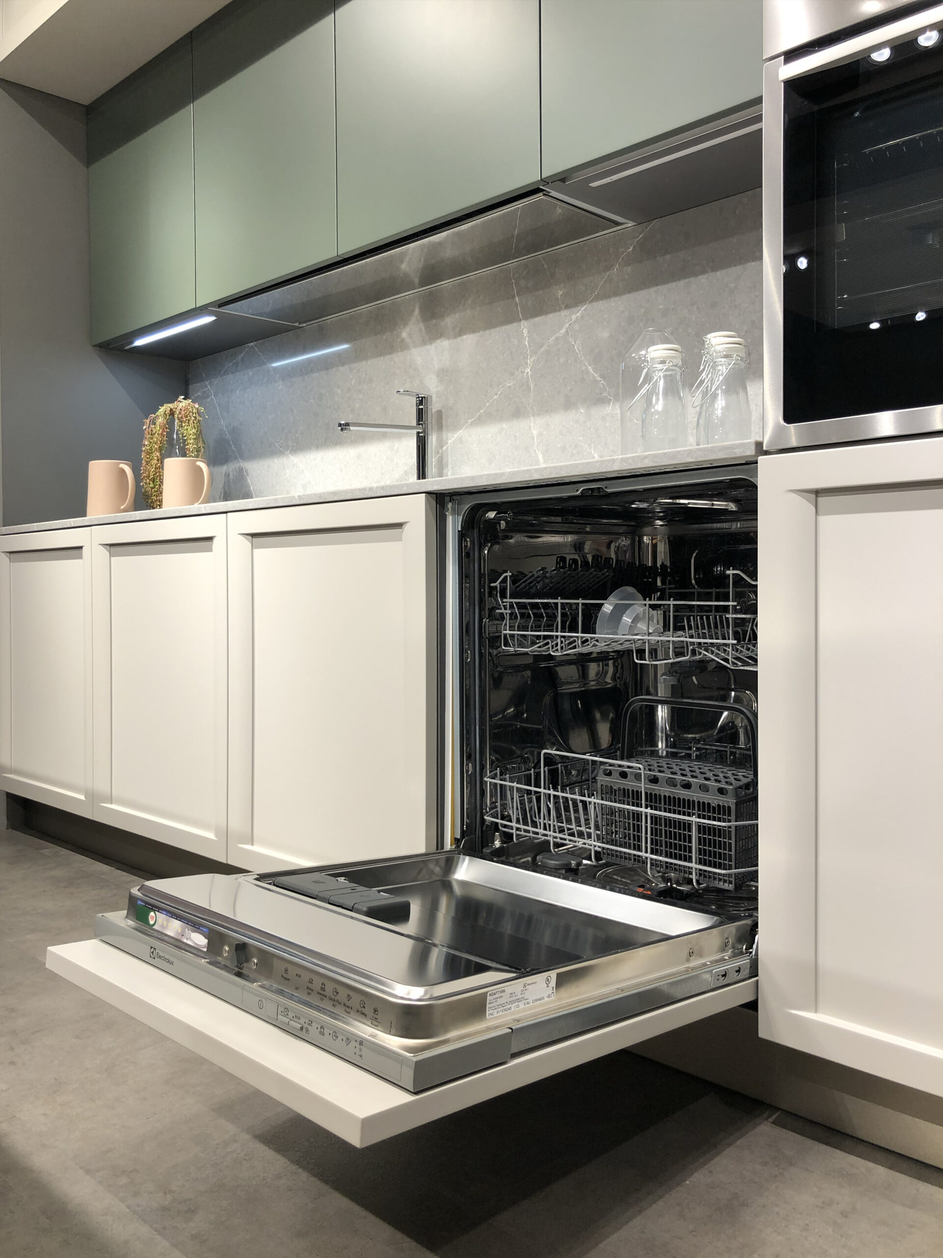 I pensili superiori in laccato opaco Verde Timo si alternano alle colonne e alle basi in laccato opaco Bianco Neve, creando un raffinato gioco cromatico che esalta la pulizia visiva dell’insieme. Il sistema di apertura con maniglia integrata permette di mantenere un’estetica essenziale e ordinata, senza rinunciare alla praticità quotidiana.