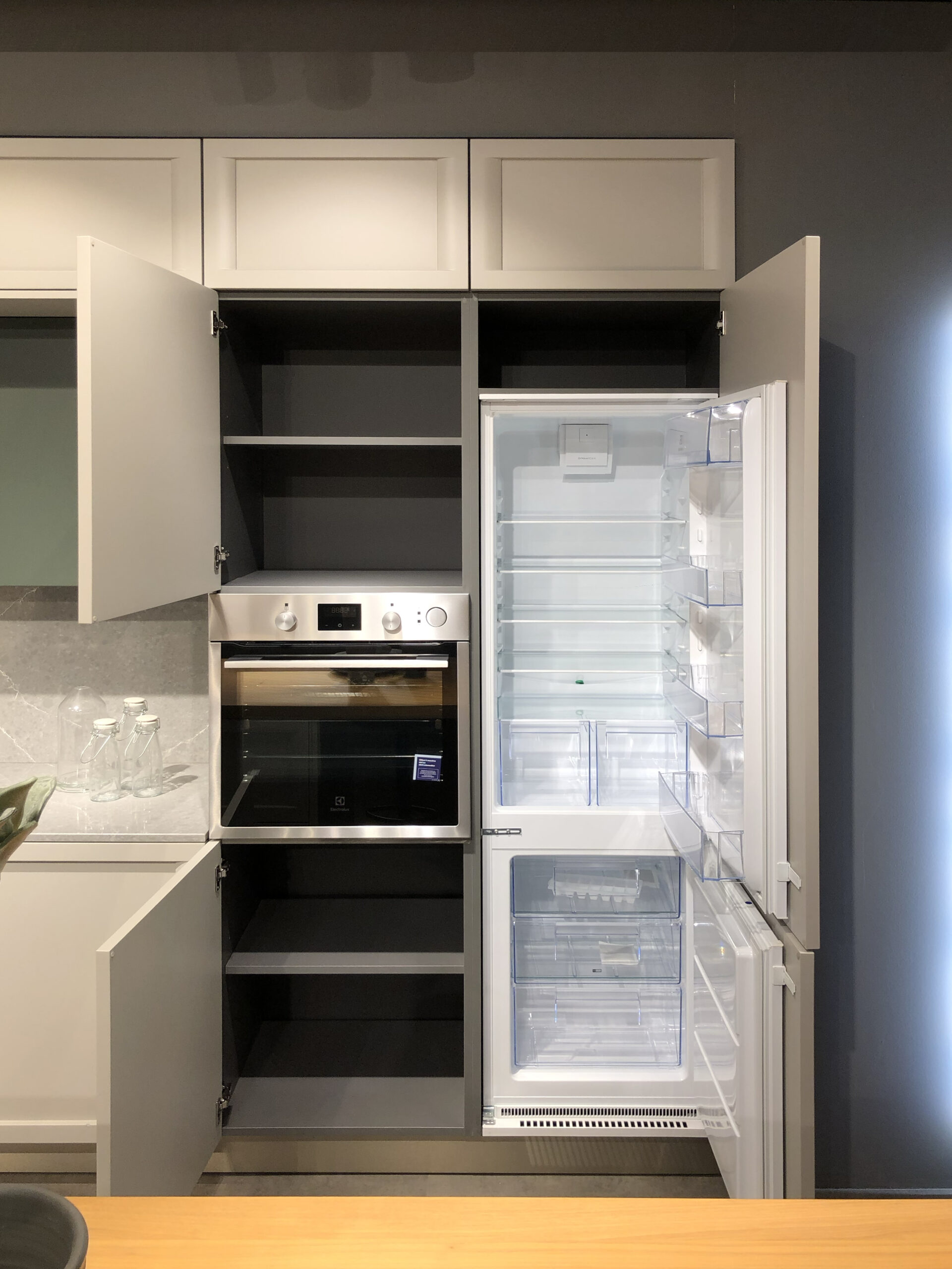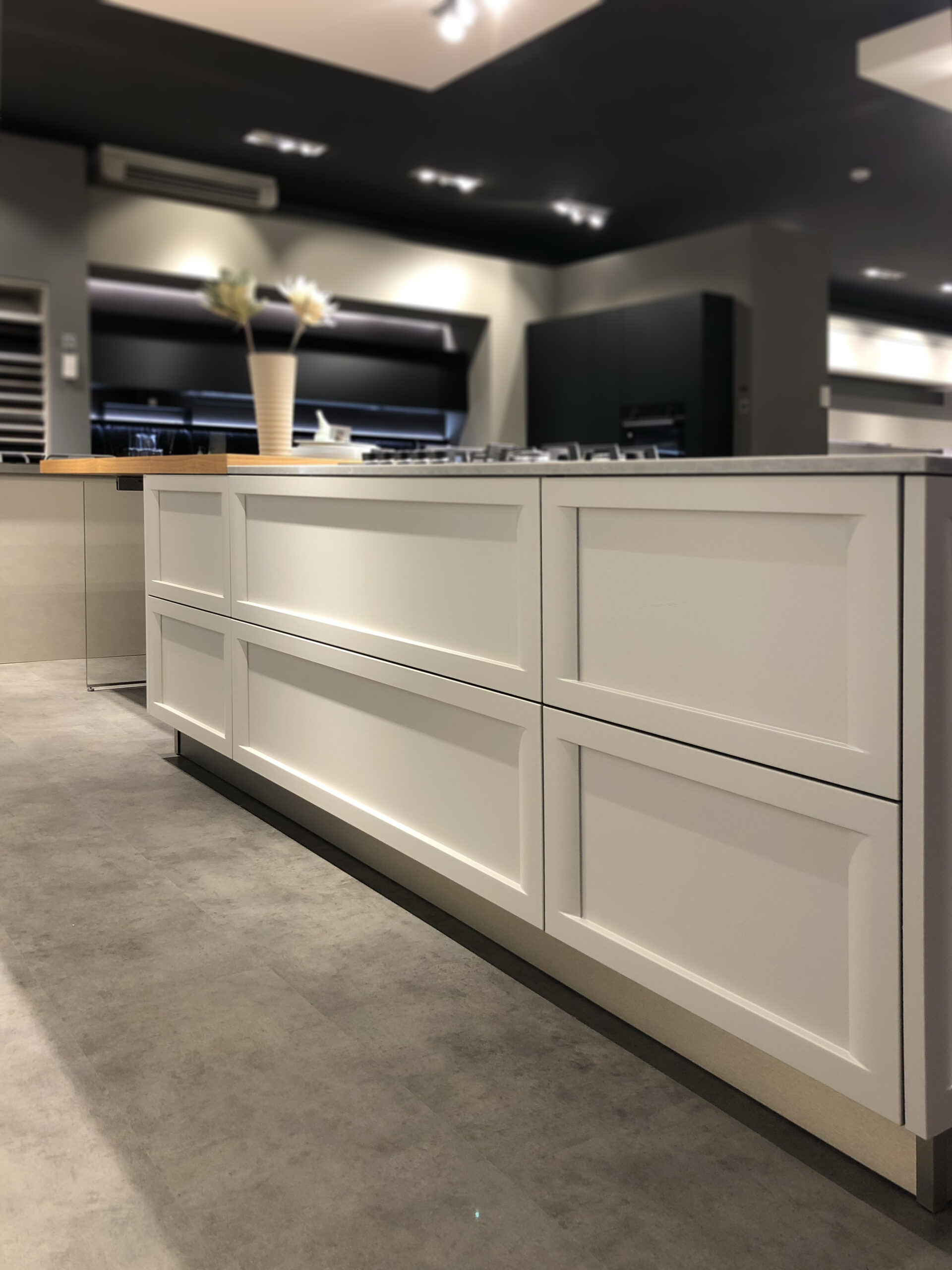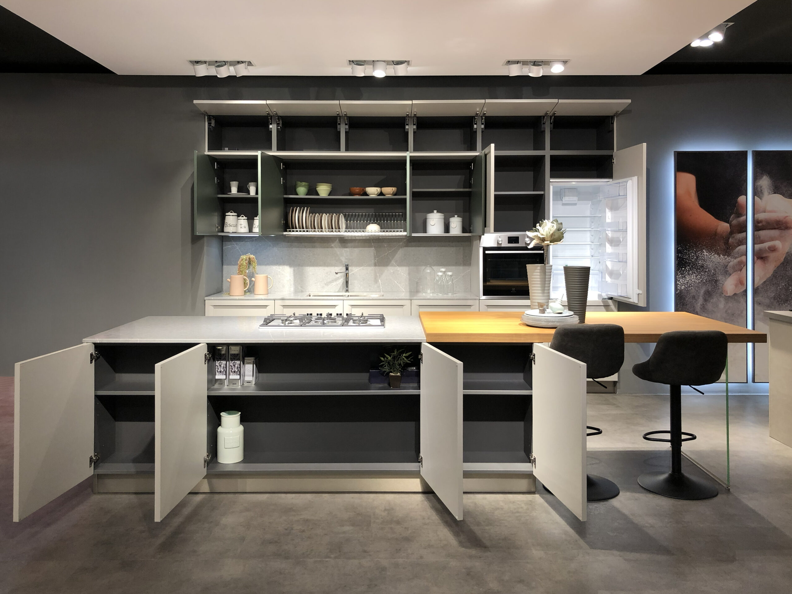 La composizione è arricchita da colonne attrezzate con vano forno e spazi contenitivi studiati per ottimizzare l’organizzazione, mentre l’isola centrale integra basi con cestoni e cassetti a estrazione totale, garantendo massima capienza e facilità di accesso. I pensili sospesi offrono ulteriori spazi contenitivi, valorizzati dalla scelta delle finiture opache che rendono la superficie elegante e vellutata al tatto.
