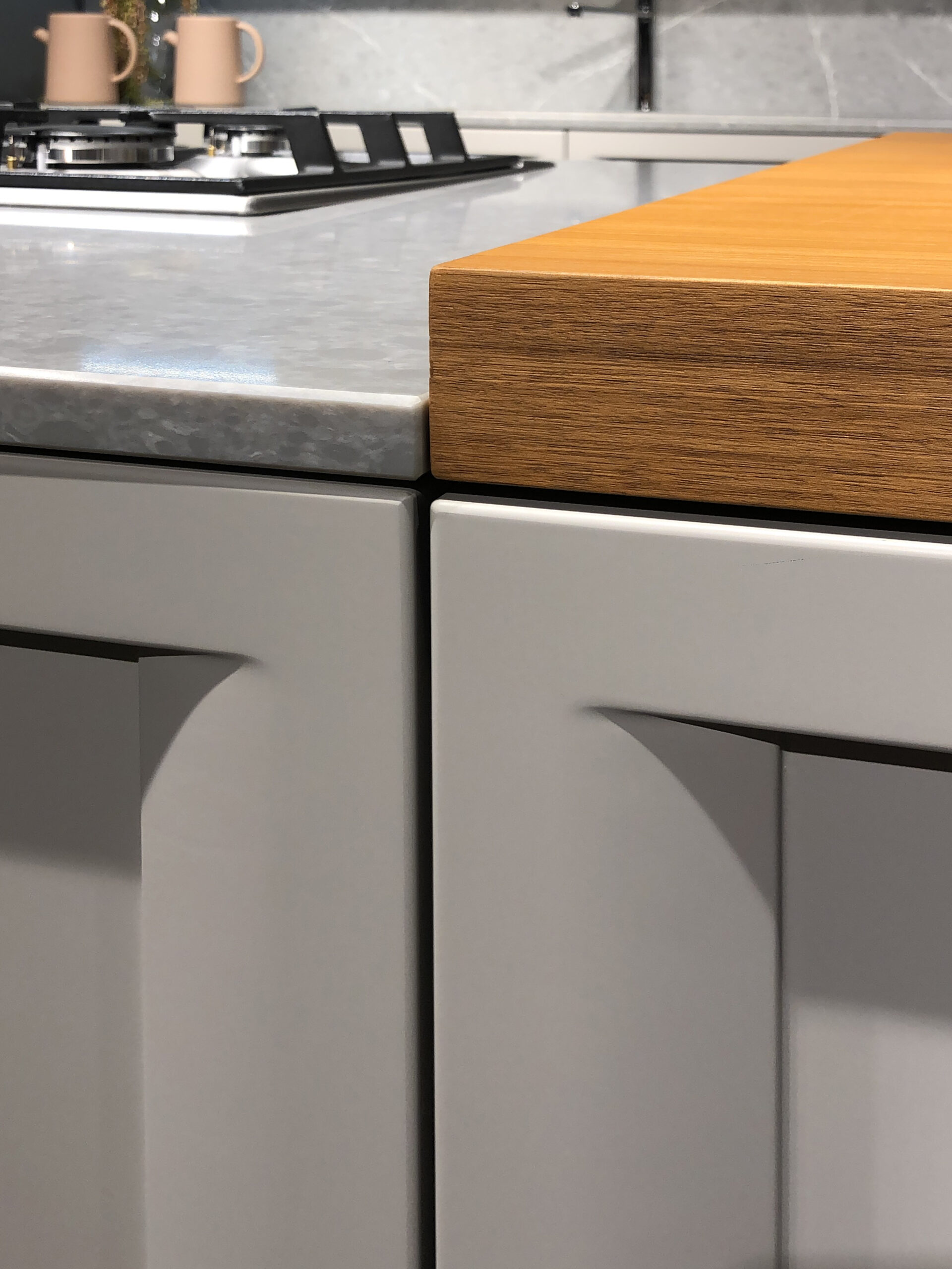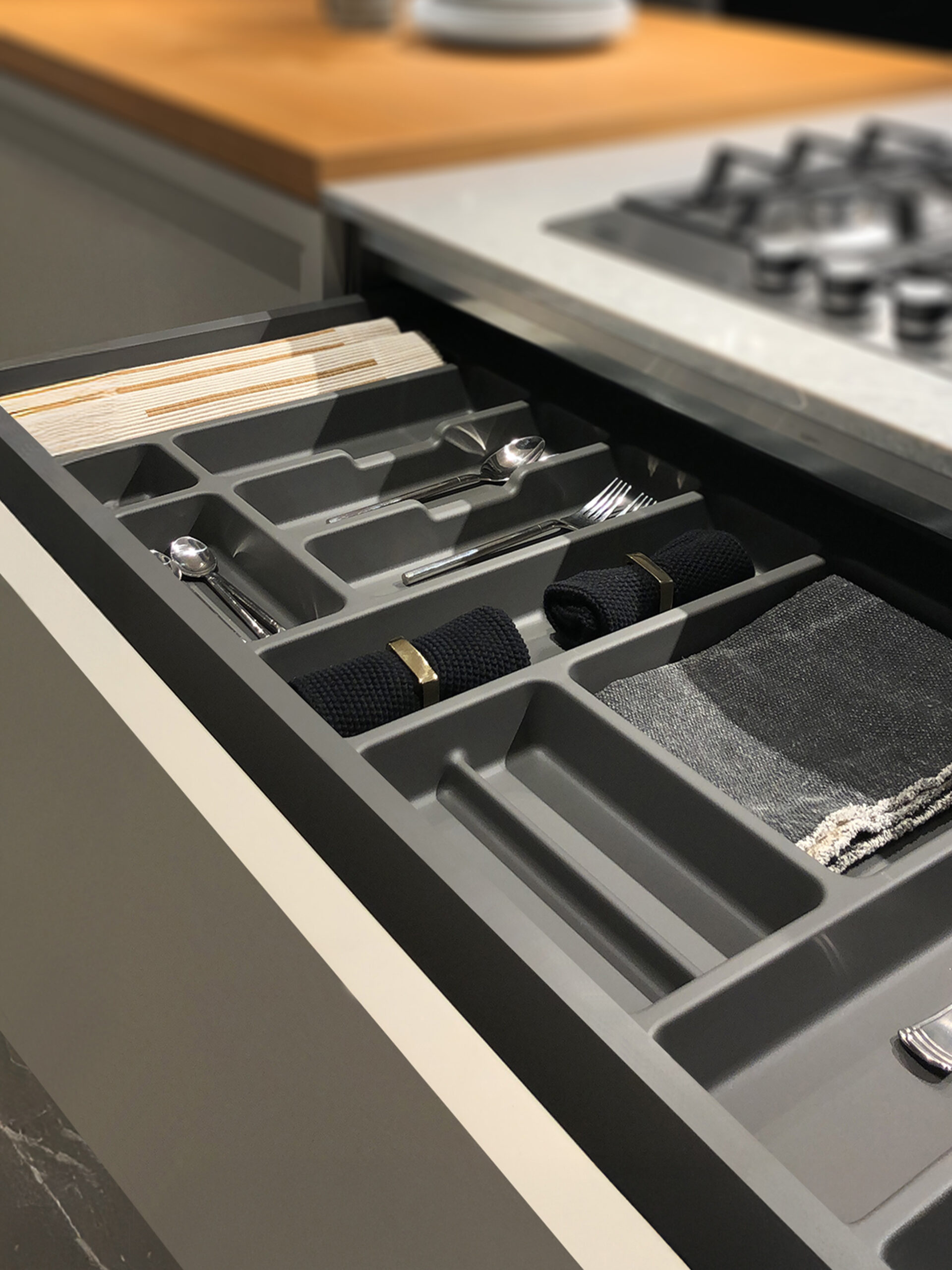 Il progetto si sviluppa attorno a una composizione con isola centrale, vero fulcro della cucina: un piano operativo ampio e versatile che ospita il piano cottura e, al contempo, funge da spazio conviviale grazie al bancone snack in legno naturale, perfetto per colazioni o momenti informali.