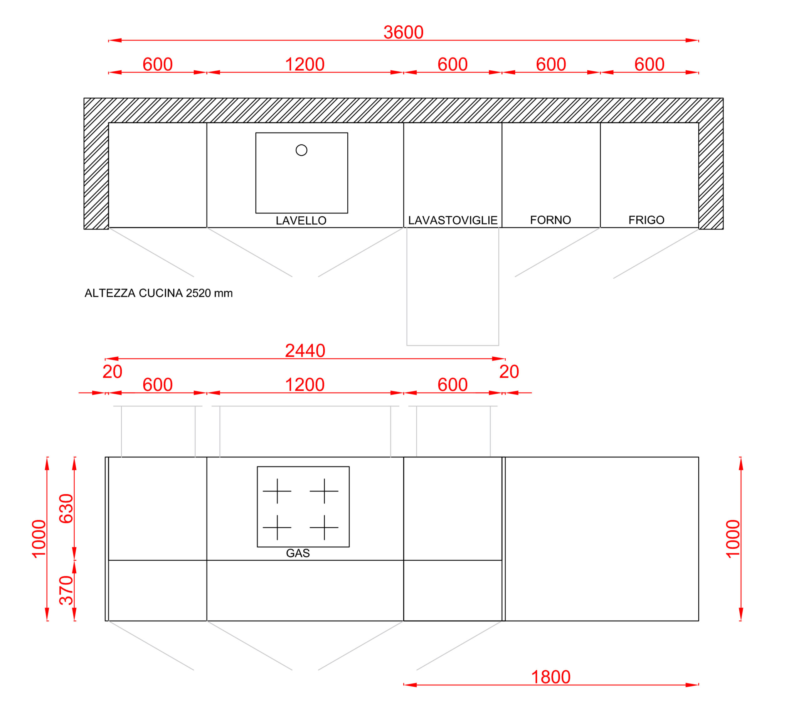 Il top e lo schienale sono realizzati in Caranto, materiale tecnico ad alte prestazioni, che garantisce resistenza e durata nel tempo. In questa configurazione il lavello è integrato nel piano, fondendo estetica e funzionalità in un unico elemento continuo e facile da pulire.