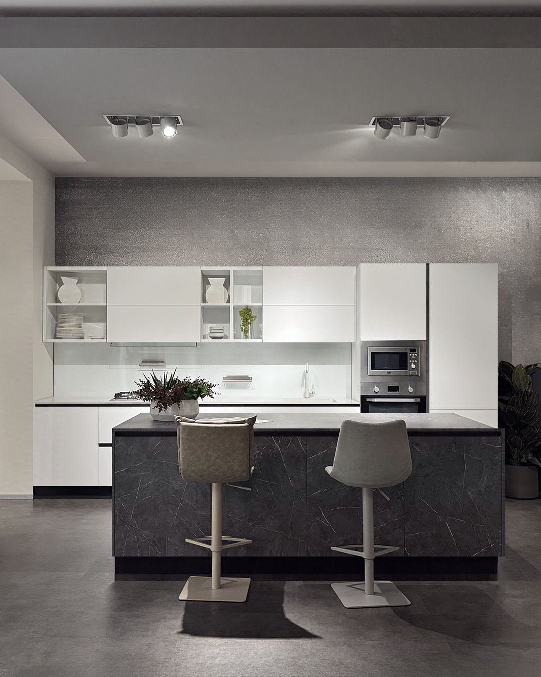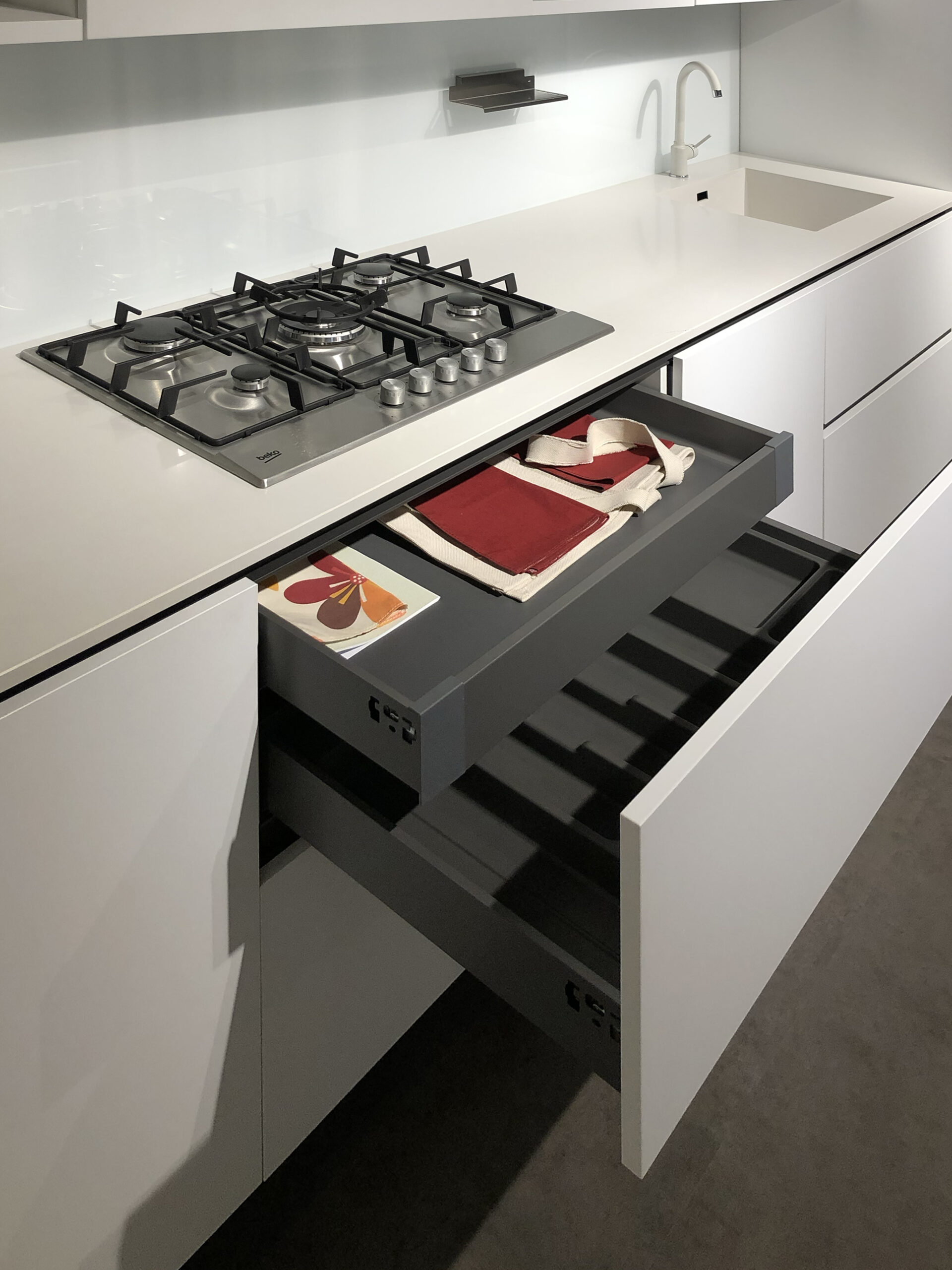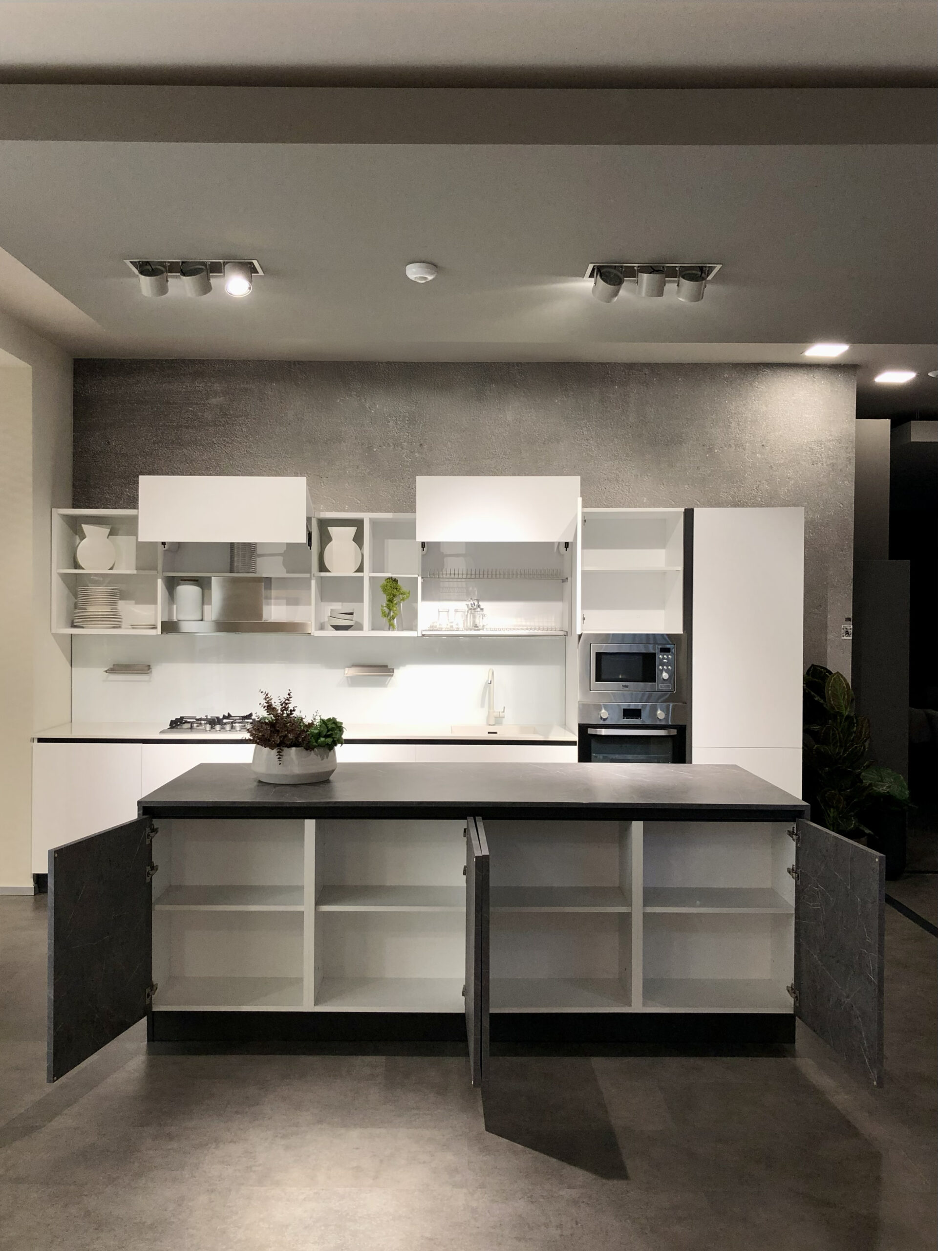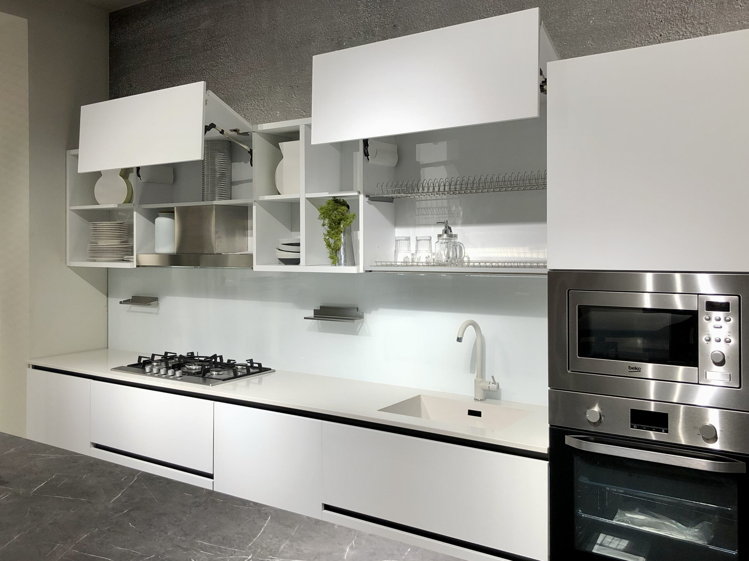 Per completare l’esperienza culinaria, la cucina Colibrì include anche un lavello integrato nel top in quarzo e un microonde con grill da incasso Beko Inox. Il miscelatore Franke modello Pola aggiunge un tocco di eleganza e funzionalità al tuo ambiente cucina.
