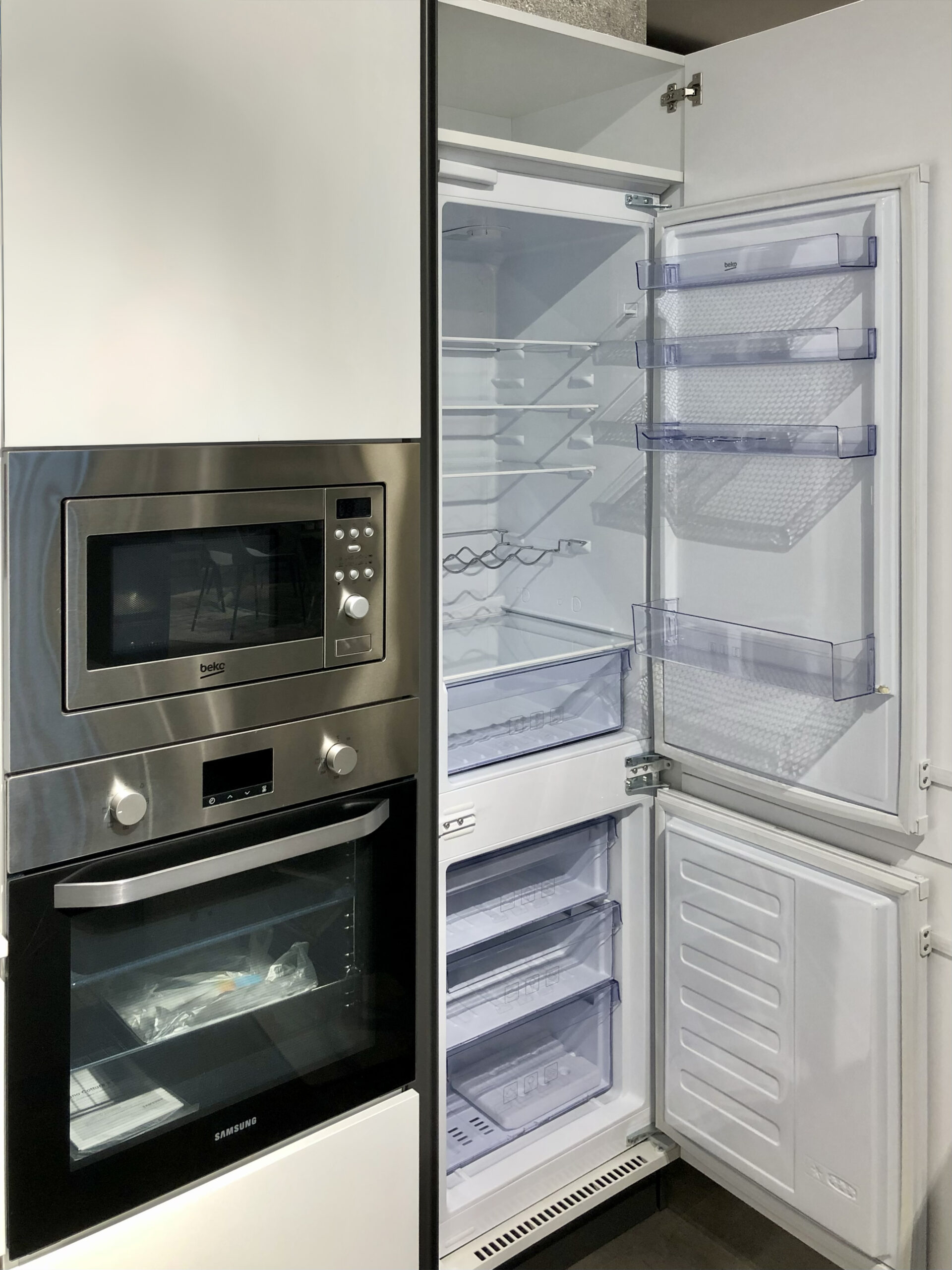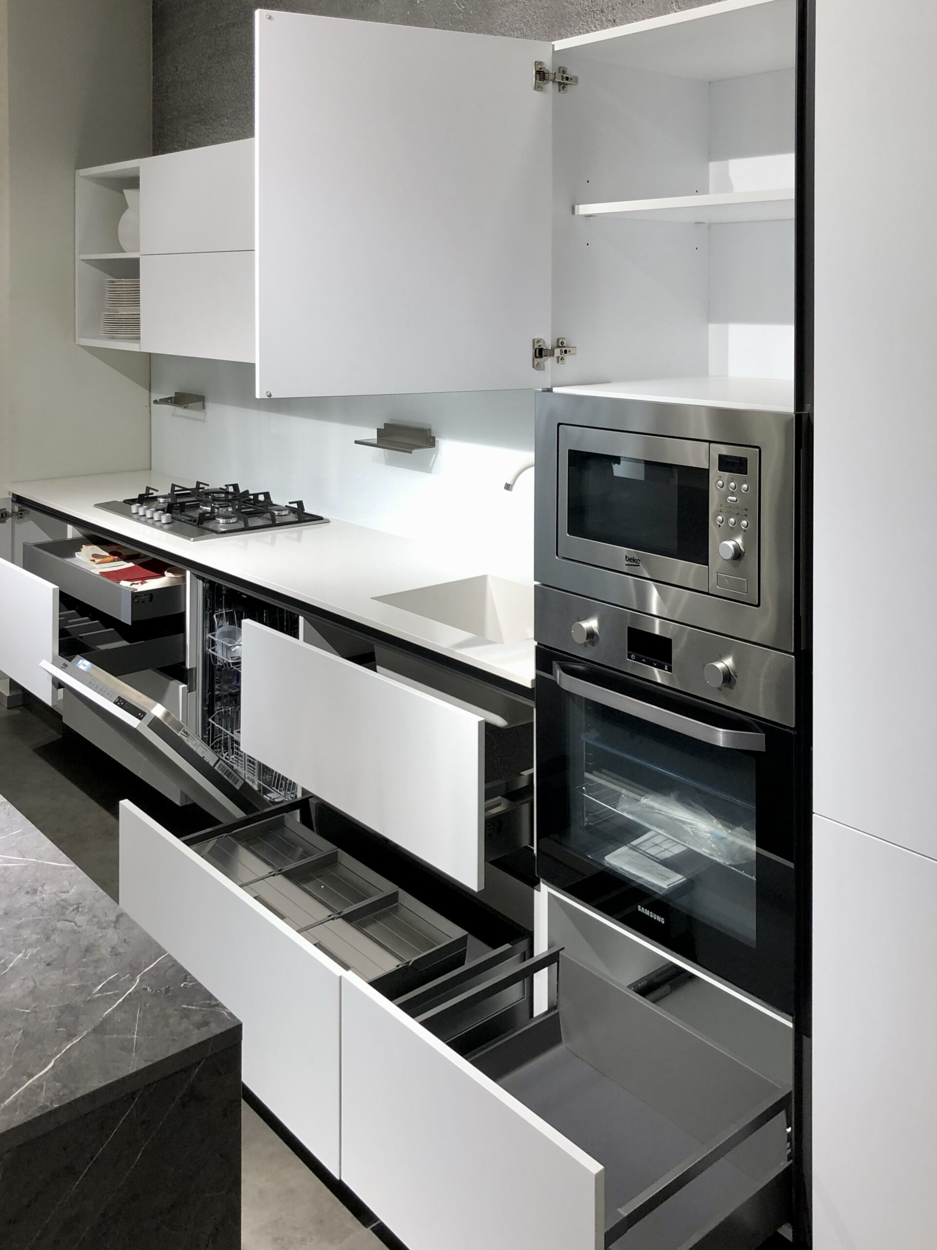 Gli elettrodomestici inclusi, tra cui il piano cottura a gas Beko, il forno multifunzione Samsung, il frigocongelatore Beko, la lavastoviglie Beko e la cappa incassata nel mobile, assicurano prestazioni ottimali e facilità d’uso.