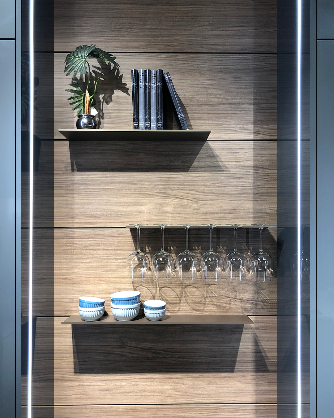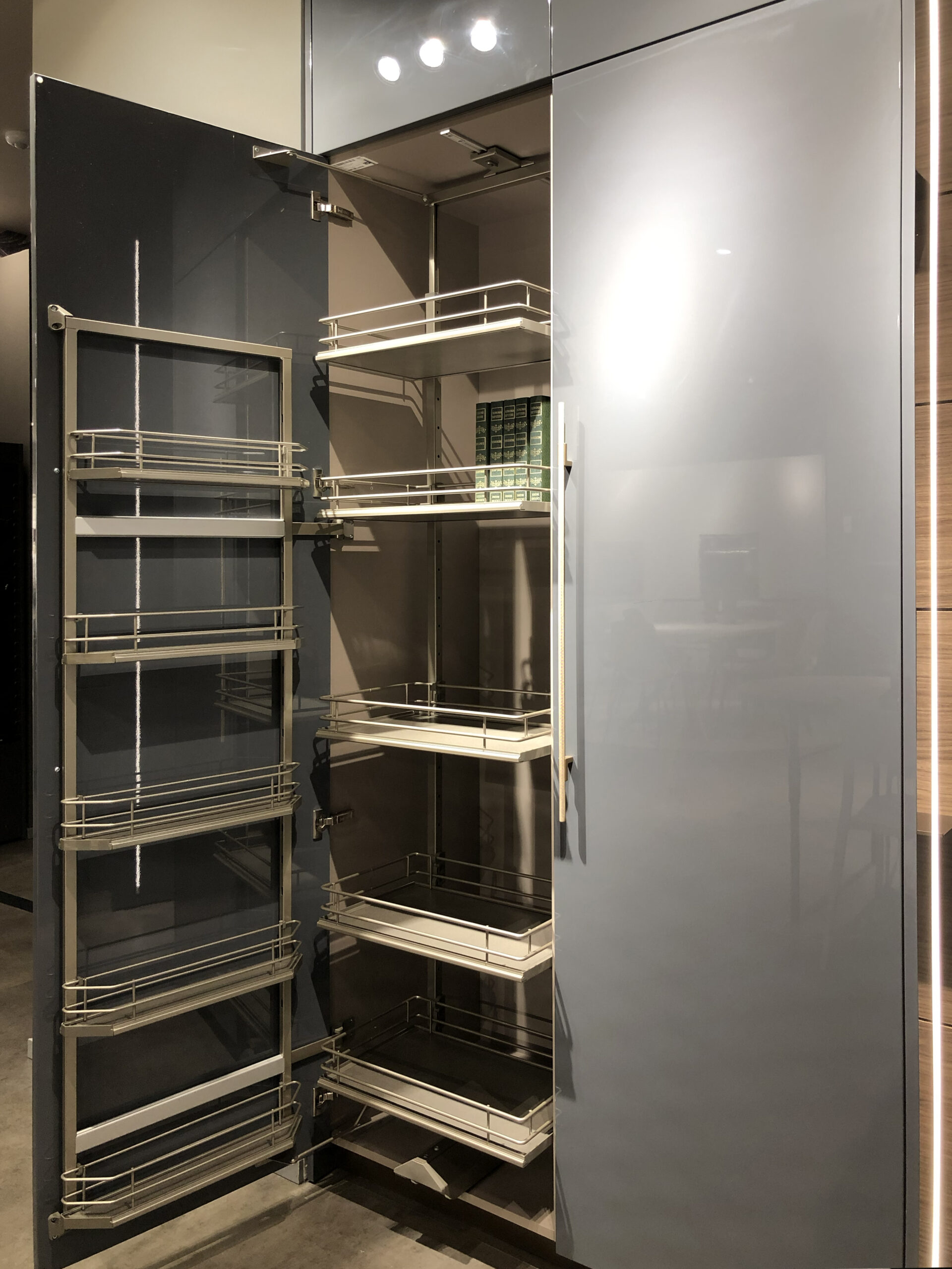 La composizione qui proposta si distingue per le ante lisce in laccato lucido Ginepro, che donano luminosità e profondità agli spazi, enfatizzando le linee pulite e rigorose tipiche dello stile contemporaneo. A contrasto, le superfici in effetto legno naturale creano un piacevole equilibrio materico, dando vita a un ambiente elegante ma accogliente.
