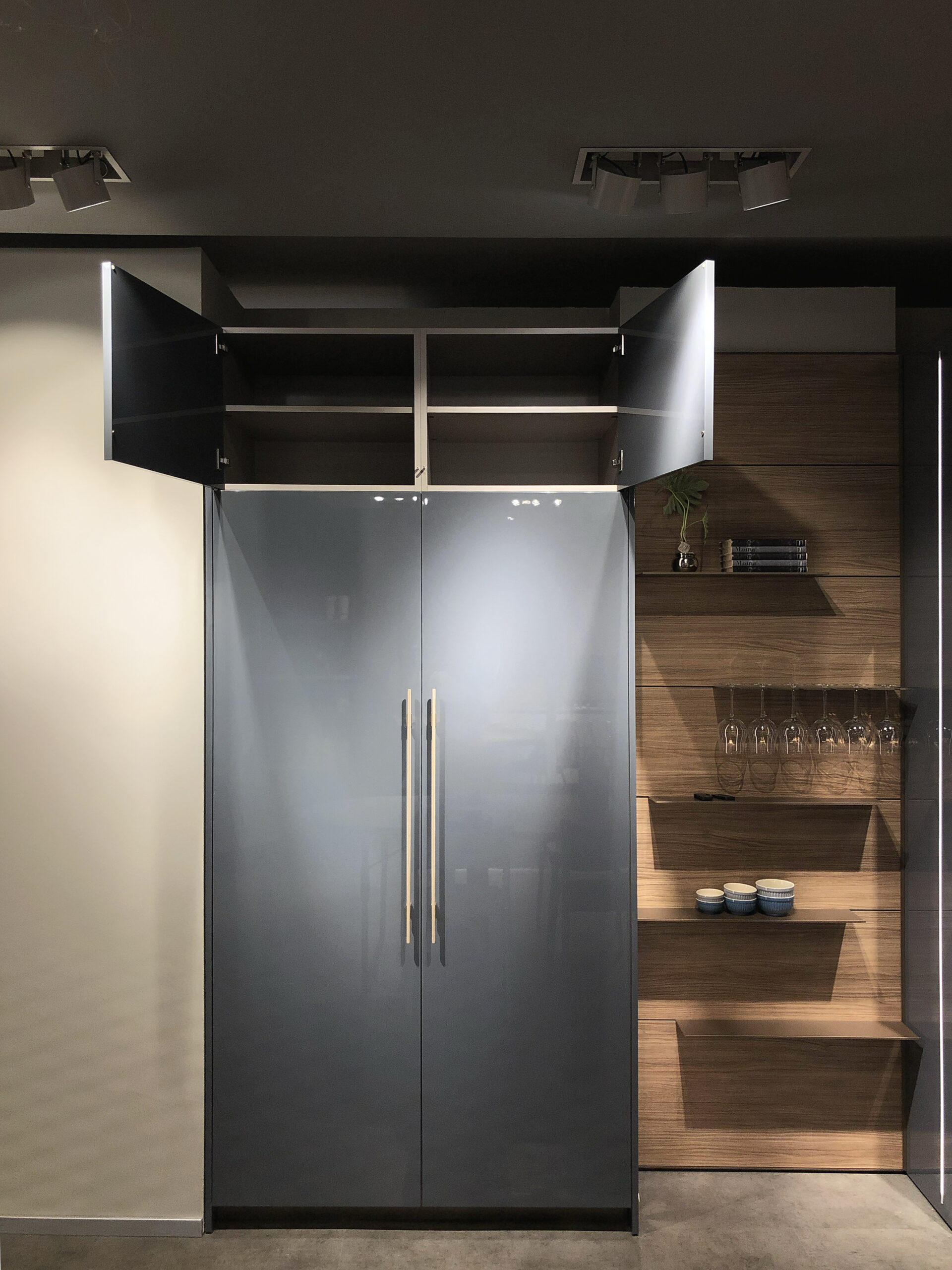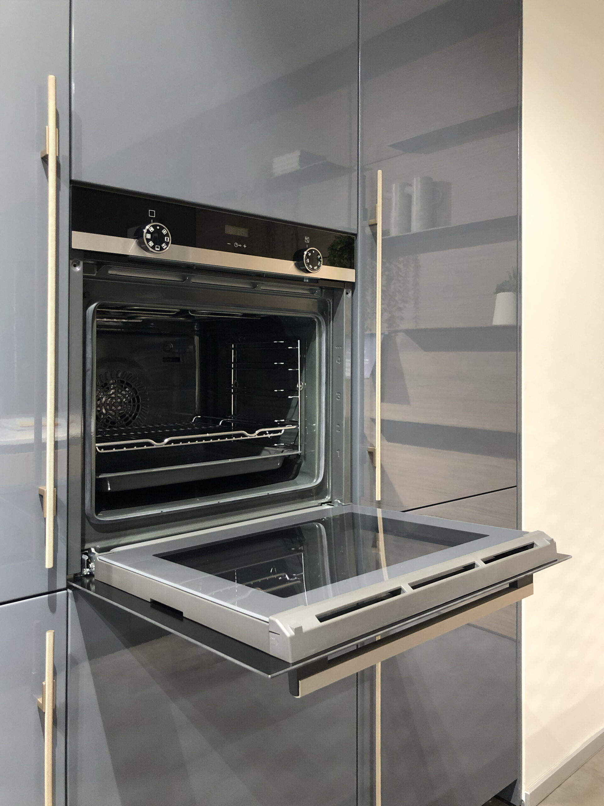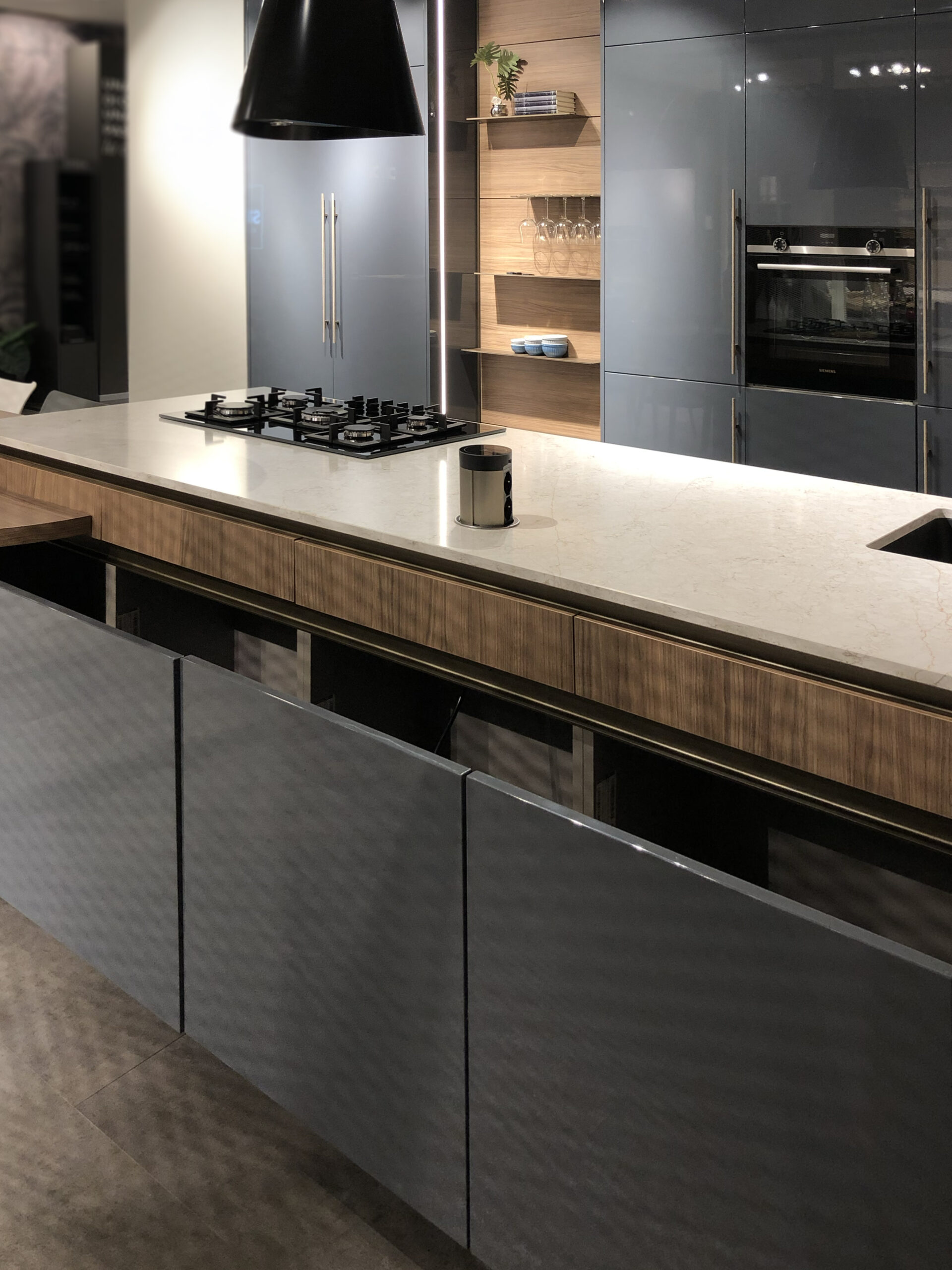Il top in quarzo garantisce resistenza e durevolezza, mantenendo al contempo un’estetica raffinata, mentre lo zoccolo e la gola in finitura bronzo – con sistema di apertura a gola scavata – conferiscono alla cucina un tocco esclusivo, eliminando la necessità di maniglie tradizionali e offrendo una continuità visiva impeccabile.