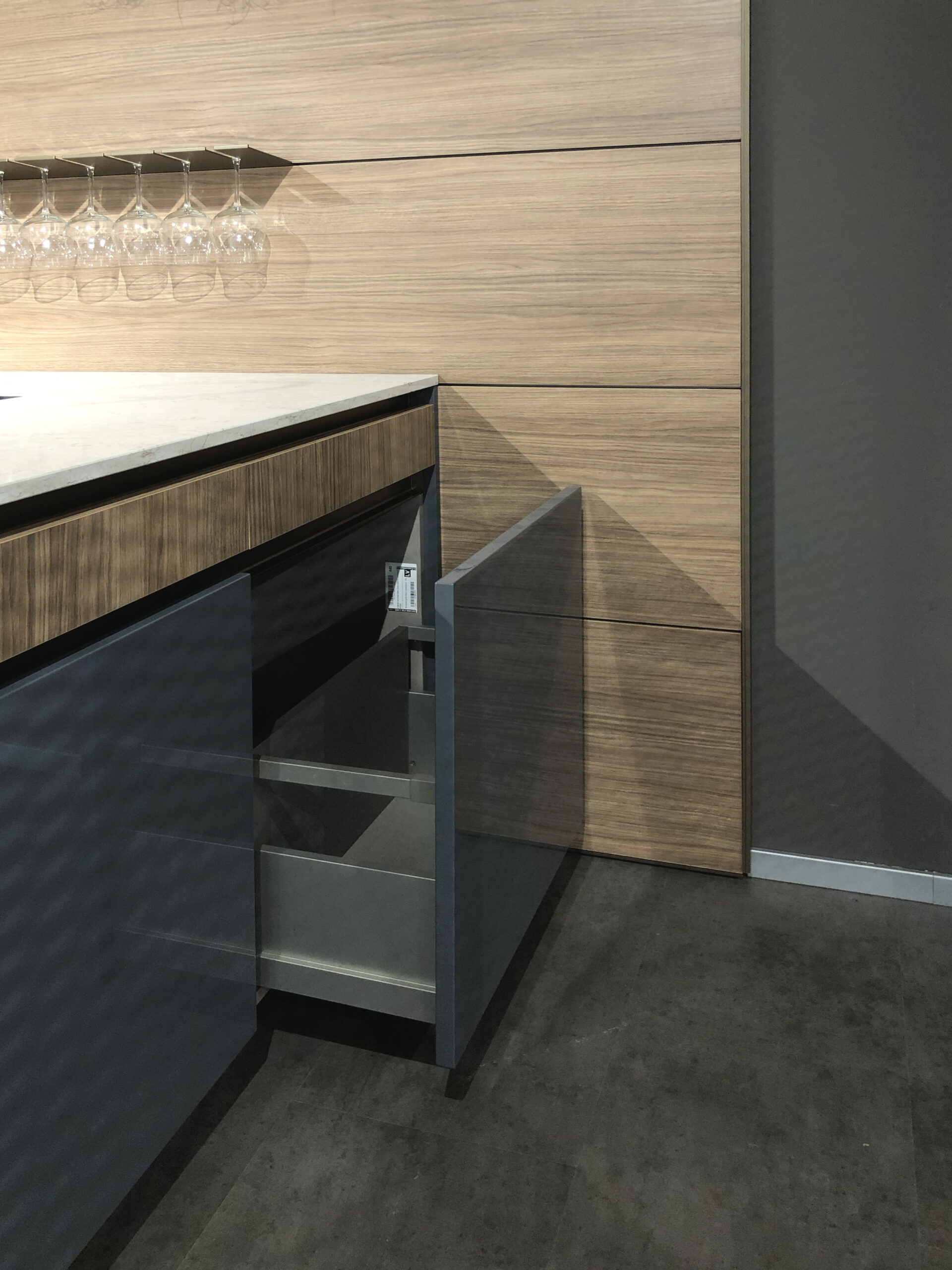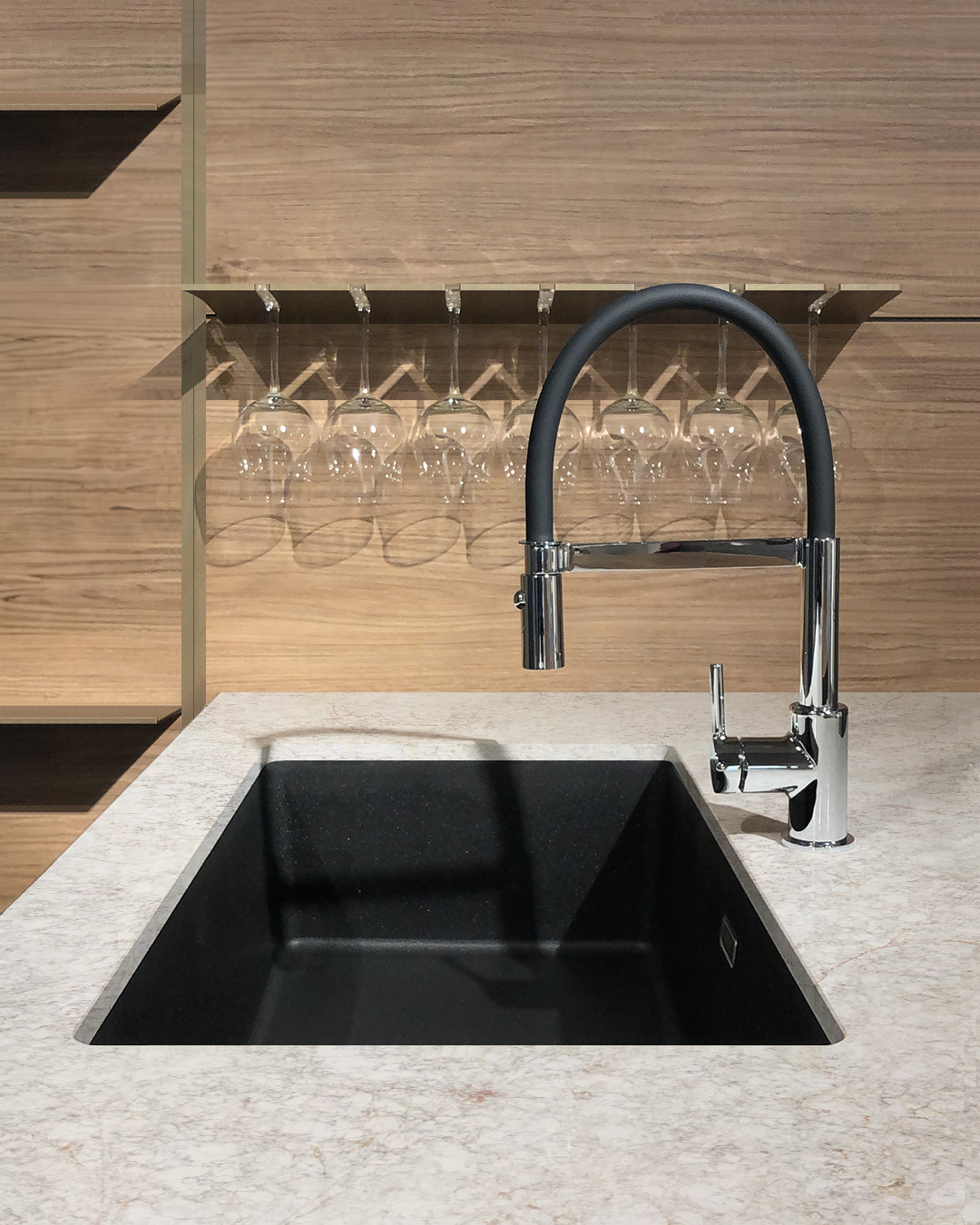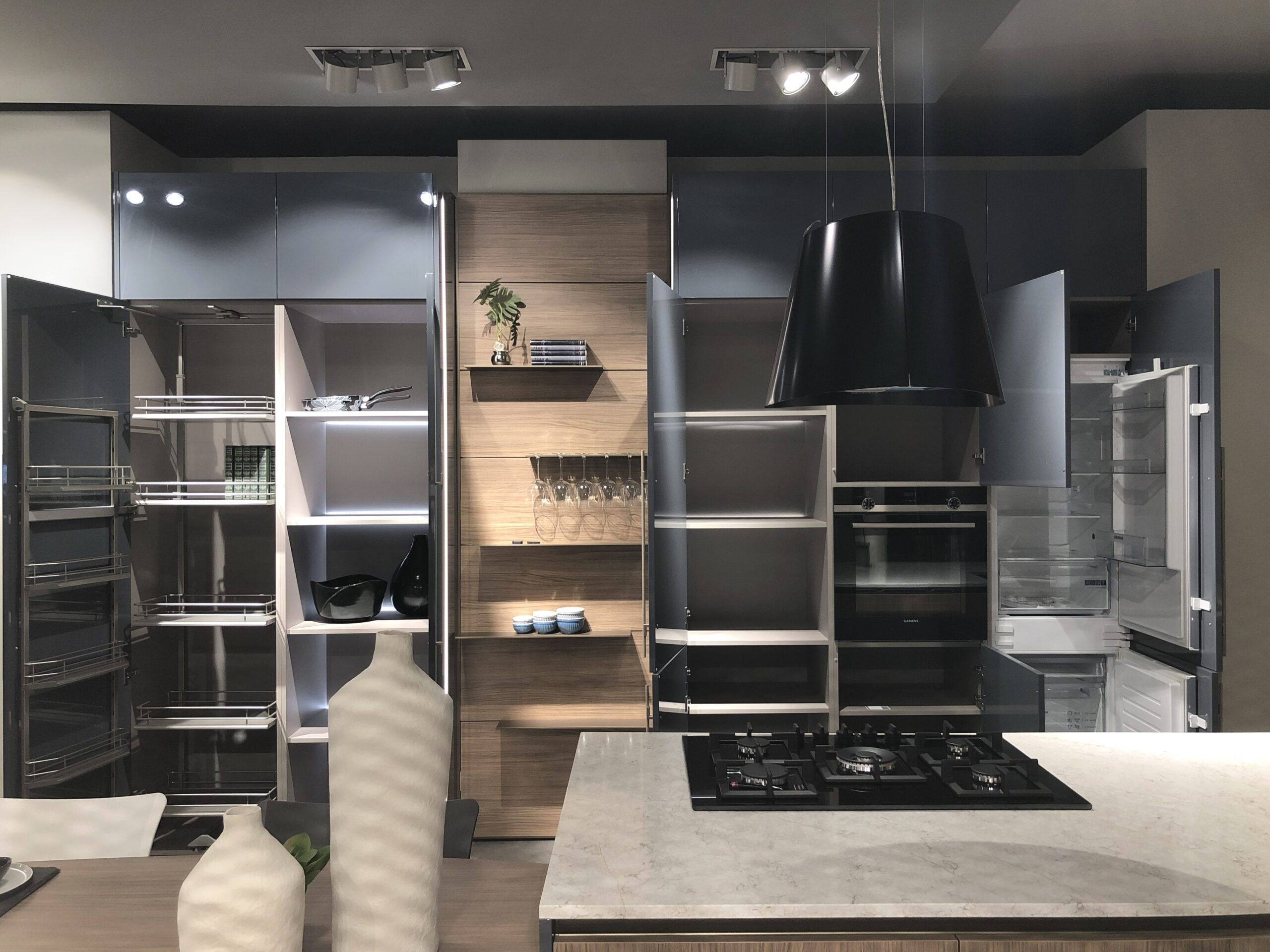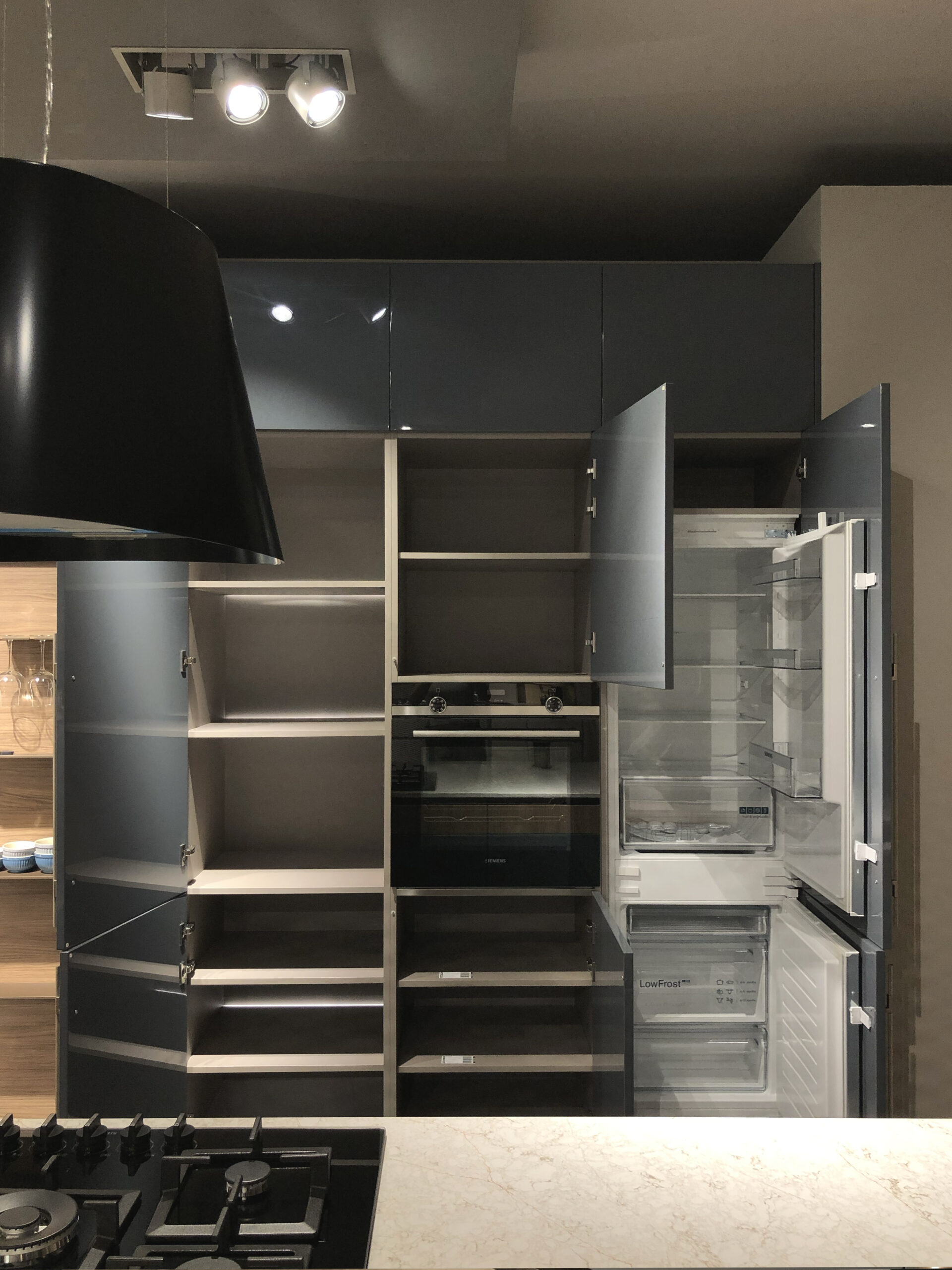 Il top in quarzo garantisce resistenza e durevolezza, mantenendo al contempo un’estetica raffinata, mentre lo zoccolo e la gola in finitura bronzo – con sistema di apertura a gola scavata – conferiscono alla cucina un tocco esclusivo, eliminando la necessità di maniglie tradizionali e offrendo una continuità visiva impeccabile.