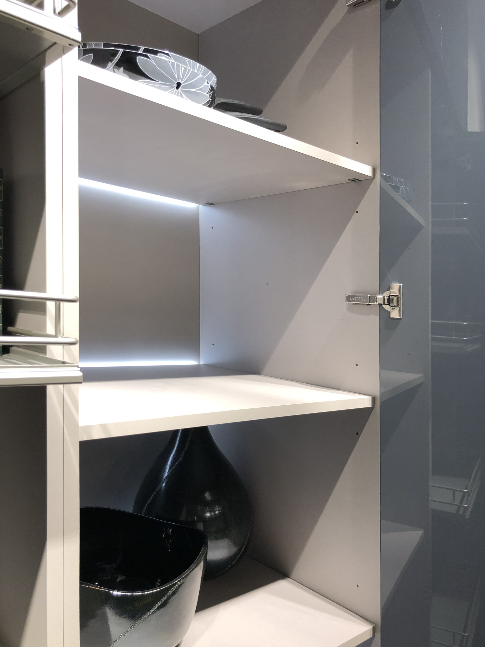 Dal punto di vista progettuale, la cucina Infinity Color Trend offre una soluzione estremamente versatile: le colonne attrezzate integrano elettrodomestici e ampi spazi contenitivi, mentre la zona operativa si sviluppa in modo funzionale con basi attrezzate e pensili che sfruttano al meglio la verticalità. Le mensole a giorno in legno alleggeriscono la composizione, diventando elementi di design ideali per valorizzare oggetti decorativi o stoviglie di uso quotidiano.