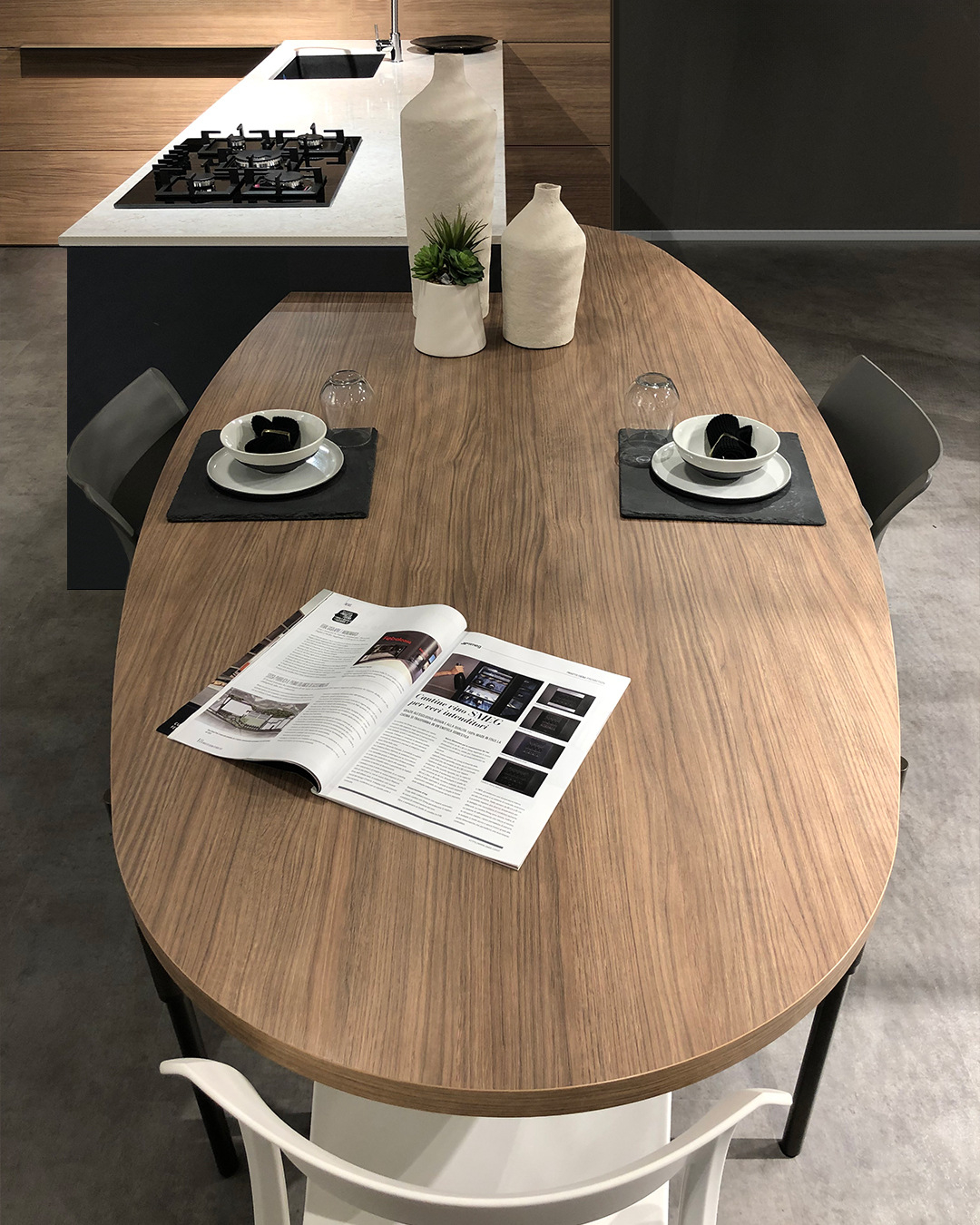 Il piano snack in legno completa l’insieme con una funzione conviviale, trasformando la cucina in un ambiente multifunzionale, adatto non solo alla preparazione dei cibi ma anche alla socialità.